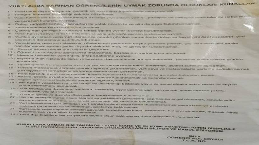 30’a yakın yasağın bulunduğu kağıtta ilk sıra “uygunsuz kıyafet yasağına” ayrılırken, ikinci sıraya da “Odalarda bulunan yatakların başı yurt müdürlüğünün istediği tarafta olacak” yazılması dikkat çekti.