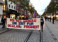 “Est Ist Genau, Die Zeit Für Ocalan’s Freiheit” ve “Abdullah Öcalan’ın Özgürlüğü için Birlikte Serhildan” pankartlarının açıldığı eylem, Almanca hazırlanan bildirinin okunmasından sonra başladı. Kentin en işlek caddelerinden olan Paradeplatz’tan başlayan eylemde Almanca ve Kürtçe sloganlar ile devletlerarası komplo protesto edilirken, “Abdullah Öcalan’a Özgürlük” talebi dile getirildi. Alman devletinin Türk devletinin soykırım saldırılarındaki rolünün de teşhir edildiği eyleme Demokratik Güç Birliği ve Alman antifaşist gençler de destek verdi.