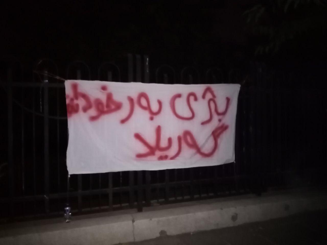 SILÊMANÎ – Başurê Kurdistan’ın Silêmanî kentinde Devrimci gençler pankart astı. İşgalci Türk devletinin Başurê Kurdistan üzerindeki işgal saldırılarına karşı Kahramanca direnen ve hemen her gün işgalci Türk askerini darbeleyen Gerilla güçlerini selamlayan Devrimci Gençler pankart astı.