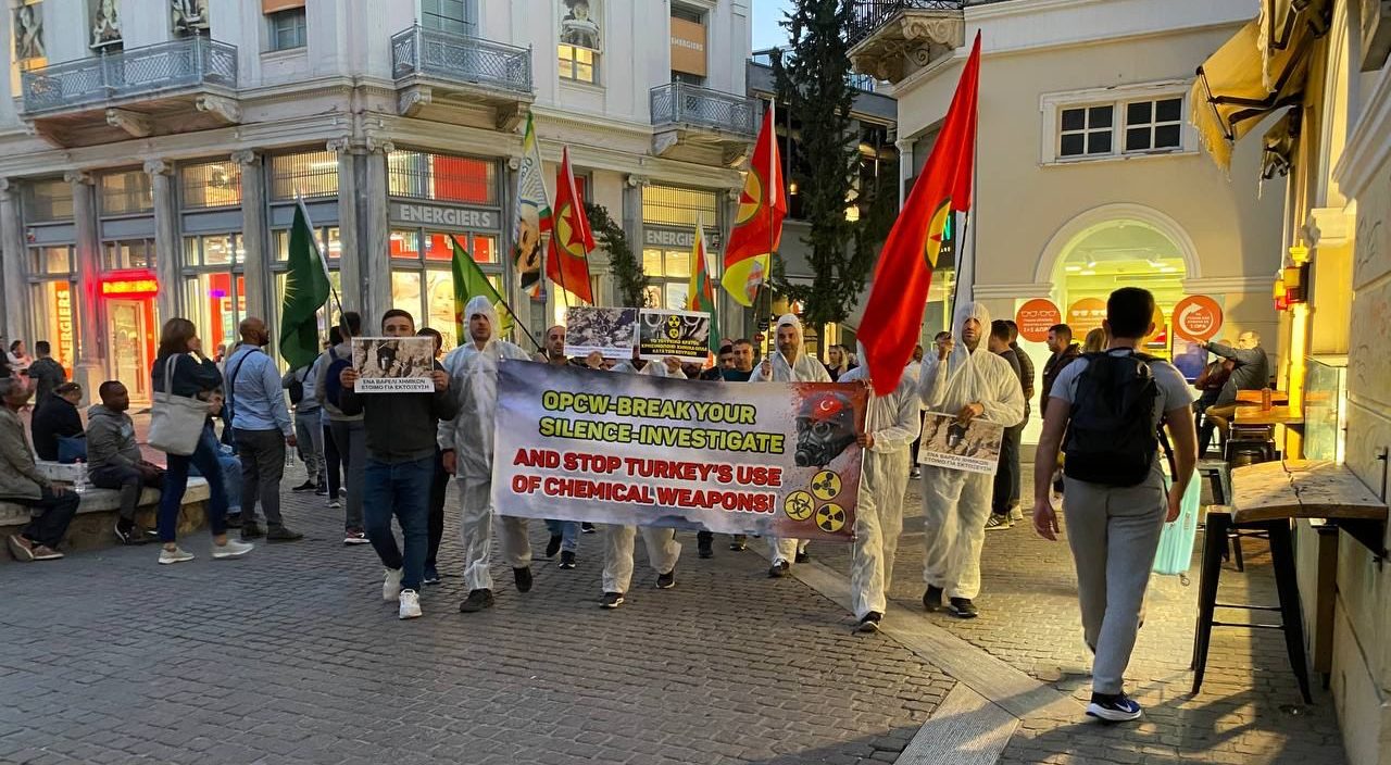 ATİNA – Faşist Türk devletinin Özgürlük gerillalarına karşı kullandığı kimyasal silahları ve insanlığa karşı işlenen suçu kınamak amacıyla TCŞ (Tevgera Ciwanên Şoreşger) gençleri, Atina’nın en işlek meydanlarından Sintegma ve Monostraki arasındaki caddede bir sivil itaatsizlik eylemi gerçekleştirildi.