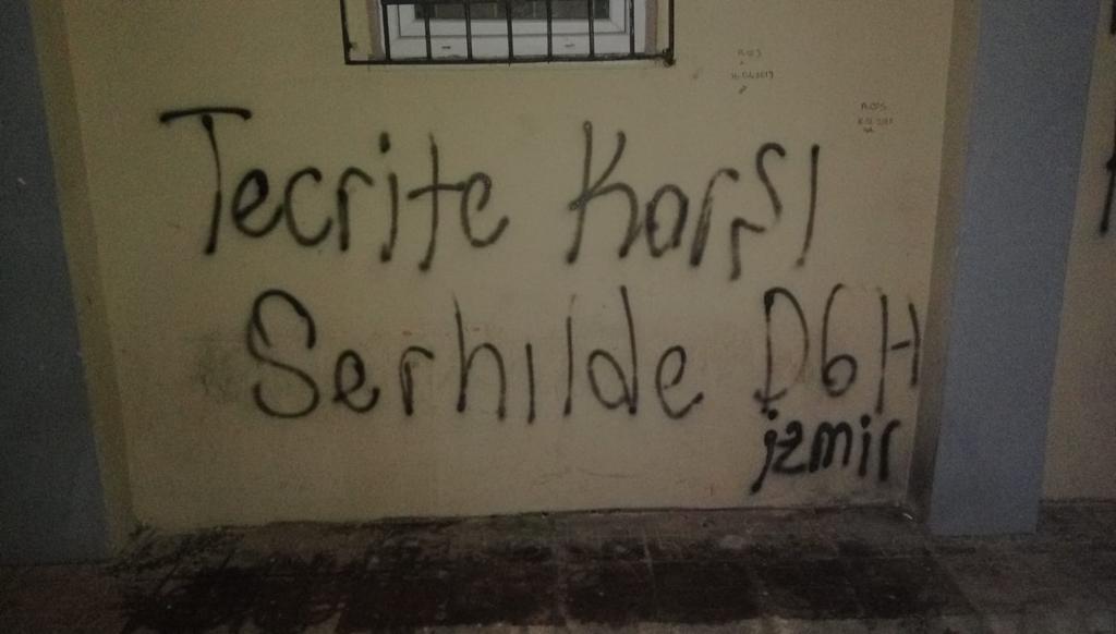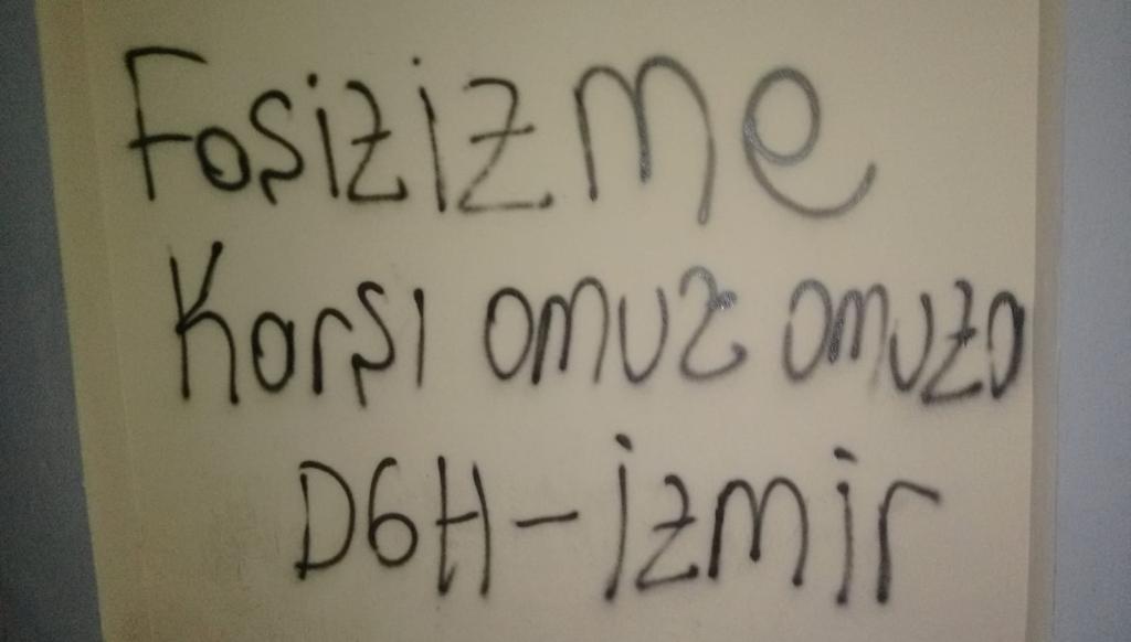 İZMİR – Devrimci Gençlik Hareketi (DGH) Halklar Önderi Abdullah Öcalan üzerindeki ağırlaştırılmış tecride karşı gelişen açlık grevlerine dikkat çekmek amacıyla İzmir’in Bornova ilçesinde yazılama eylemi yaptı.