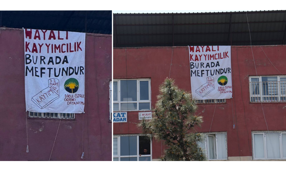 AMED- Dicle Özgür Öğrenci Dayanışması üyeleri tarafından Amed Büyükşehir Belediyesinin karşısına üzerine “Hayali Kayyum Burada Meftundur” yazılı pankart asıldı. Gençler tarafından yapılan bu eylem ile birlikte kayyum zihniyetinin direniş ve mücadele sonucunda yok edildiği ve tarihe karıştığı belirtilirken kazananın “halkın iradesi” olduğuna dikkat çekildi.