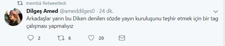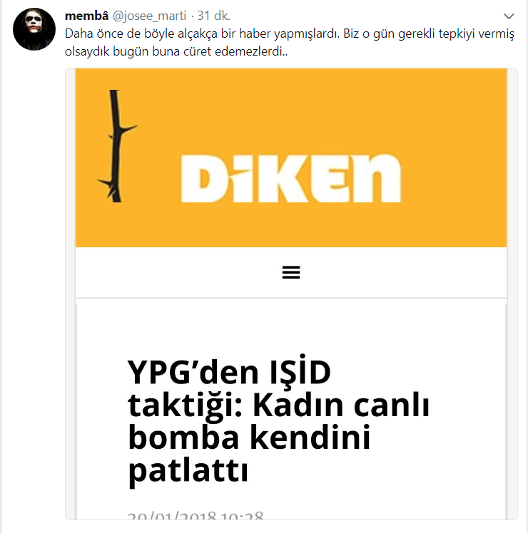 HABER MERKEZİ- Türk devleti Efrîn’e yönelik işgal girişimiyle beraber ve sahadaki özel savaşı da hat safhada tutuyor. Havuz medyasının yayınladığı yalanlar ve dezenformasyonlar herkesin bilgisi dahilindedir. Ancak görünen o ki, sadece havuz medyası değil, kendini ‘özgürlükçü basın’ ‘tarafsız’, ‘demokrat’ olarak tanımlayan bazı basın yayın kuruluşları da bu havuza girmiş bulunmakta. Daha önce “YPG’den IŞİD taktiği: Kadın Canlı Bomba Kendini Patlattı” haberini yapıp terörizm ve işgale karşı kendi topraklarını ve halkını savunan YPG ile barbar katil sürüsü DAİŞ’lileri aynı kefeye koyan DİKEN.com.tr, bu defa Salih Müslim’in tam da Prag’da gözaltına alındığı iddiasının gündeme geldiği günde iğrenç bir habere imza atarak, havuz medyasından geri kalmadığını bir kez daha gösterdi. Diken Twitter hesabında “İstanbul’da Çocuklara Tecavüz Edilen Çiftliğin Sahibi Tutuklandı” başlıklı haberinde PYD eski eş genel başkanı Salih Müslim’in fotoğrafını kullanarak ne denli savaşı desteklediğini ve ne kadar alçalabileceklerini gösterdi. Yaklaşık 15 dk boyunca haberi kaldırmayan DİKEN.COM.TR sitesi, sosyal medyada gelen yoğun tepkiler üzerine haberini kaldırıp düzeltti. Ancak başta Salih Müslim ve Kürt halkından özür dileyip dilemeyeceği veya konuyla ilgili bir açıklama olup olmayacağı belli değil.