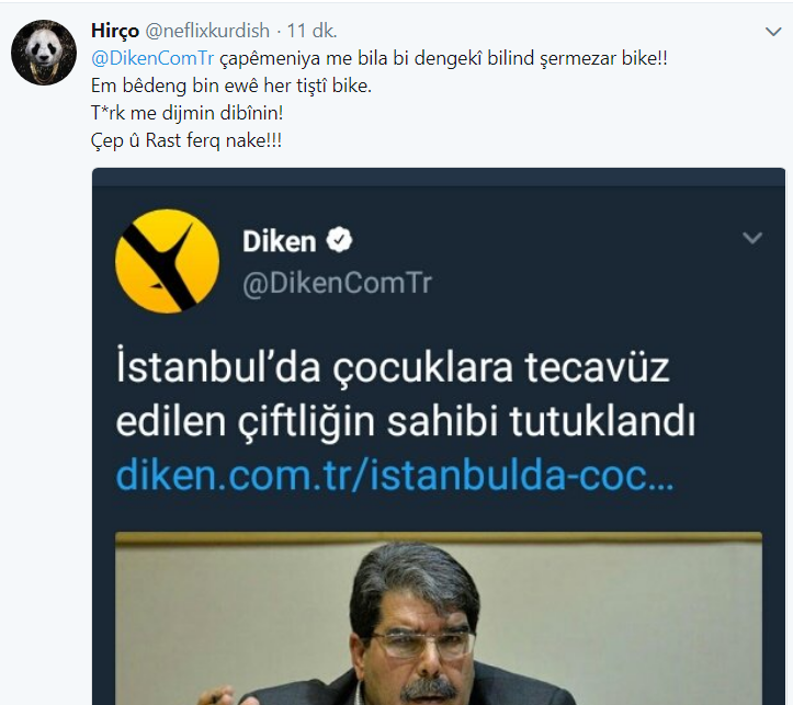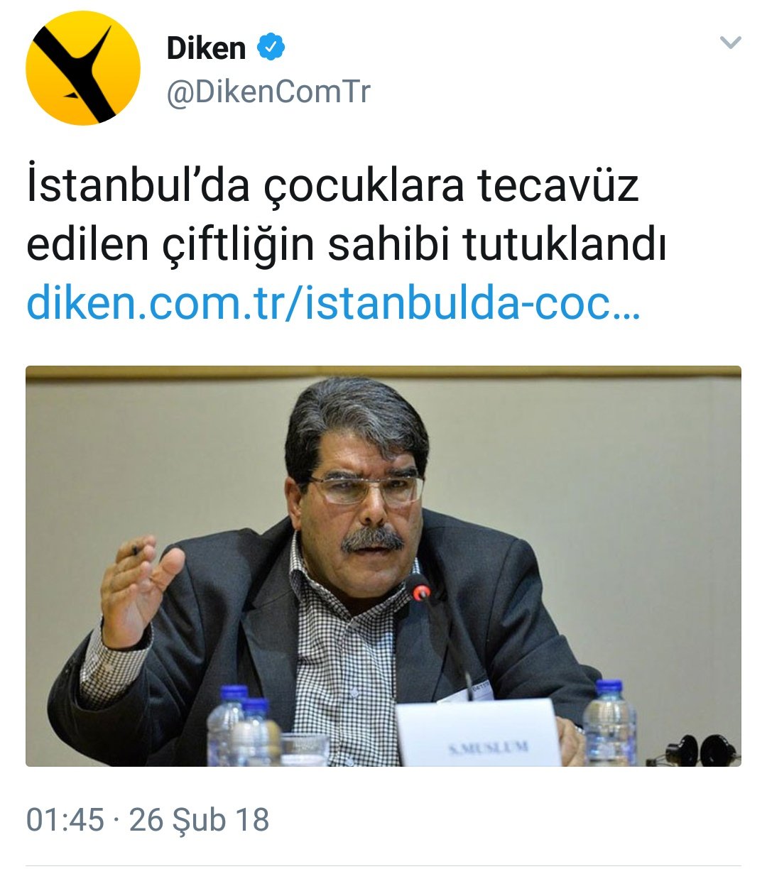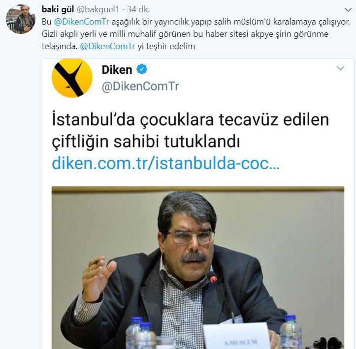 Diken.com kendi internet sitesin üzerinden yayınladığı ‘’İstanbul’da çocuklara tecavüz edilen çiftliğin sahibi tutuklandı’’ başlıklı haberde Eski PYD eş başkanı Salih Müslim’in fotoğrafını paylaştı.