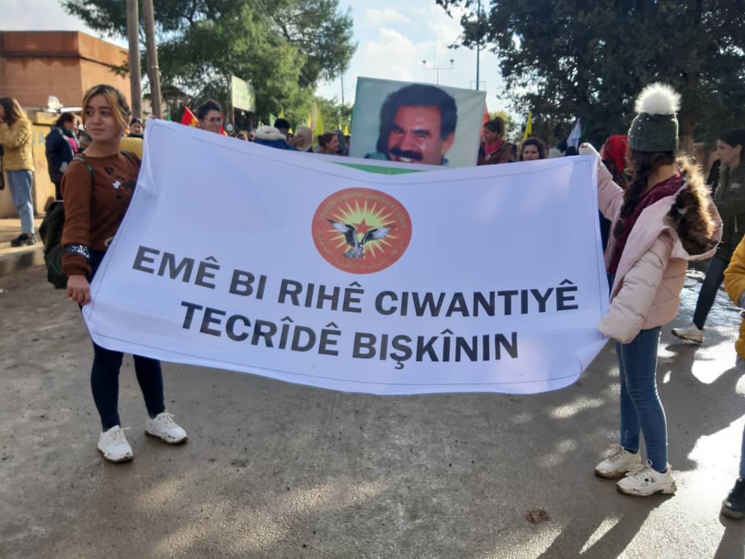 DİRBÊSÎYE – Rojava’nın Dirbêsiyê ilçesinde Ciwanên Şoreşger öncülüğünde yapılan bir yürüyüş eylemi ile Halklar Önderi Abdullah Öcalan üzerindeki ağırlaştırılmış tecrit kınandı.