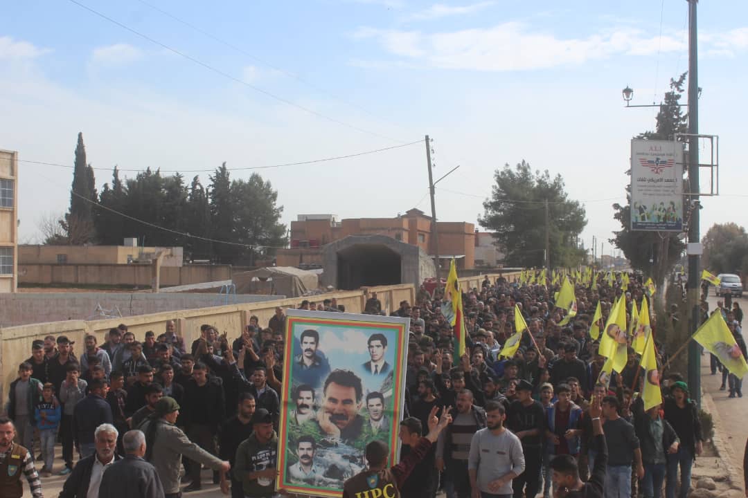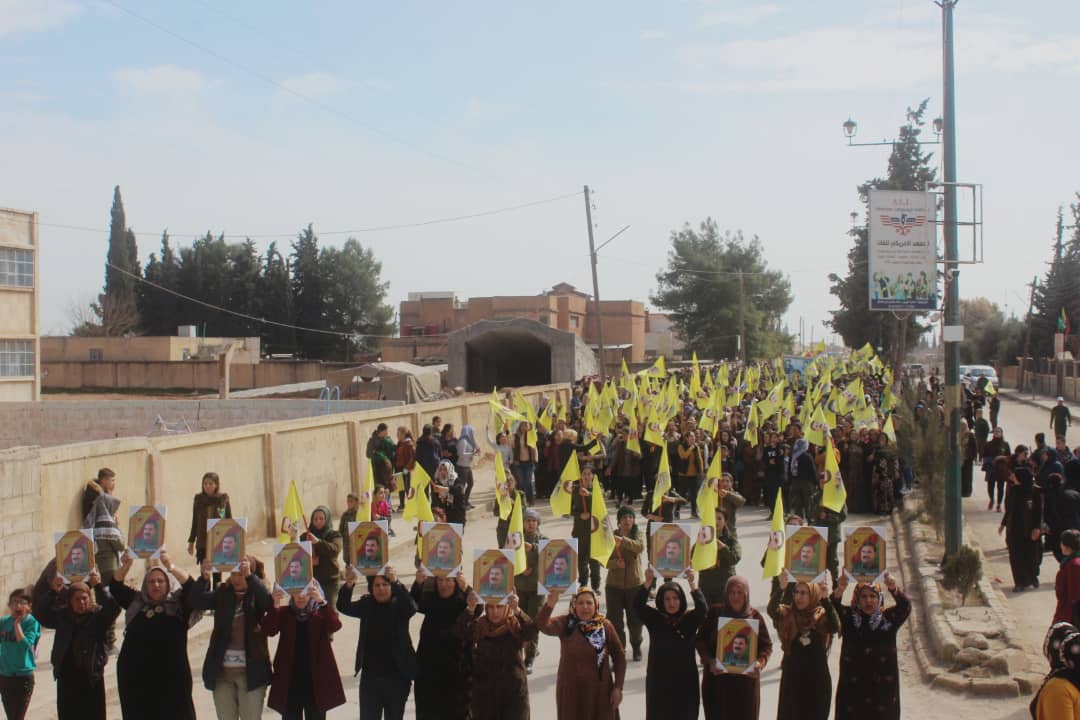 DİRBESİYÊ – Hesekê’nin Dirbesiyê ve Zirgan ilçelerinden binlerce yurttaş Halklar Önderİ Abdullah Öcalan’dan haber alınması talebiyle yürüyüş gerçekleştirdi. Siyasi parti temsilcileri, sivil toplum örgütü temsilcileri ve aşiret liderlerinin de katıldığı yürüyüş, Dirbesiyê Gençlik Merkezi önünde başladı. Yürüyüşçüler üzerinde “Öcalan’a uzanan elleri kıracağız” yazılı pankart taşıdı.