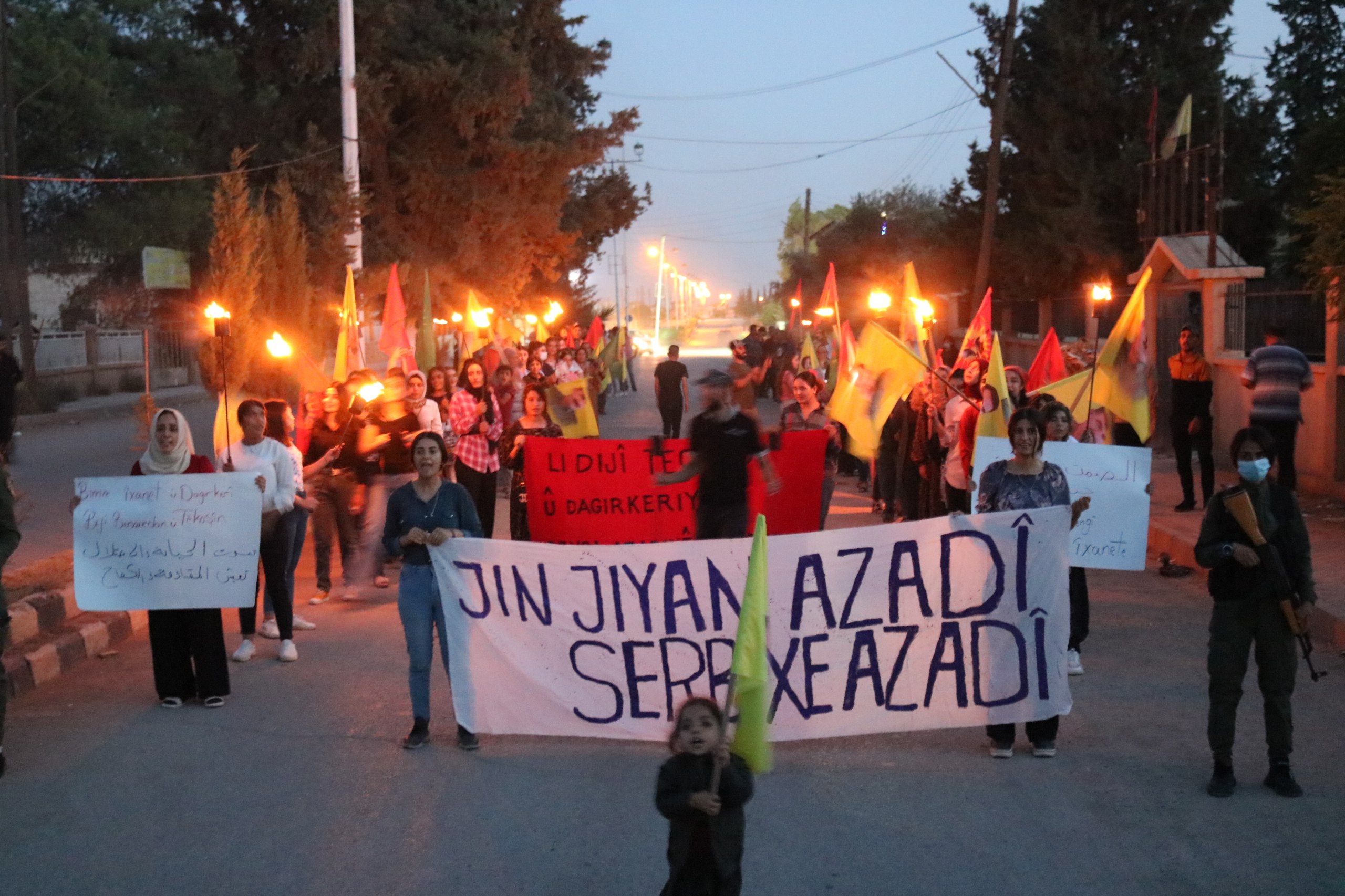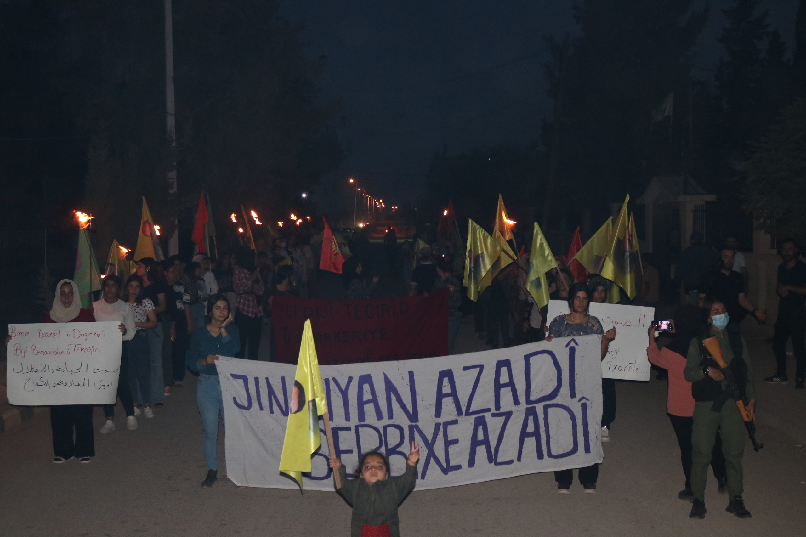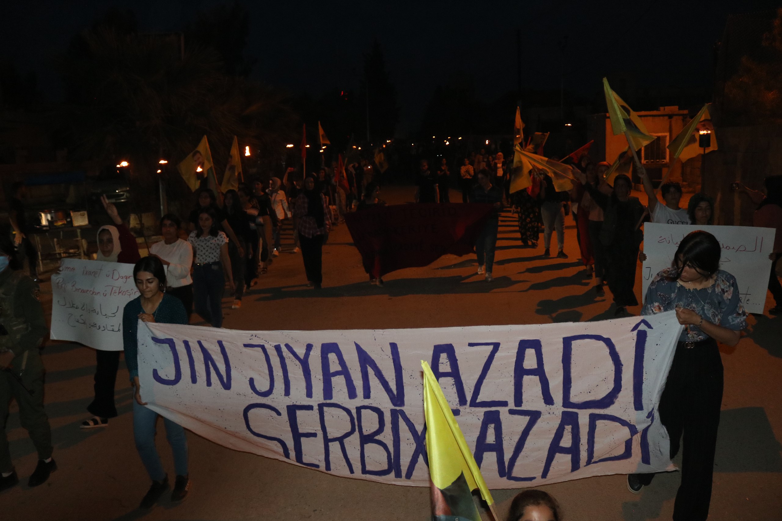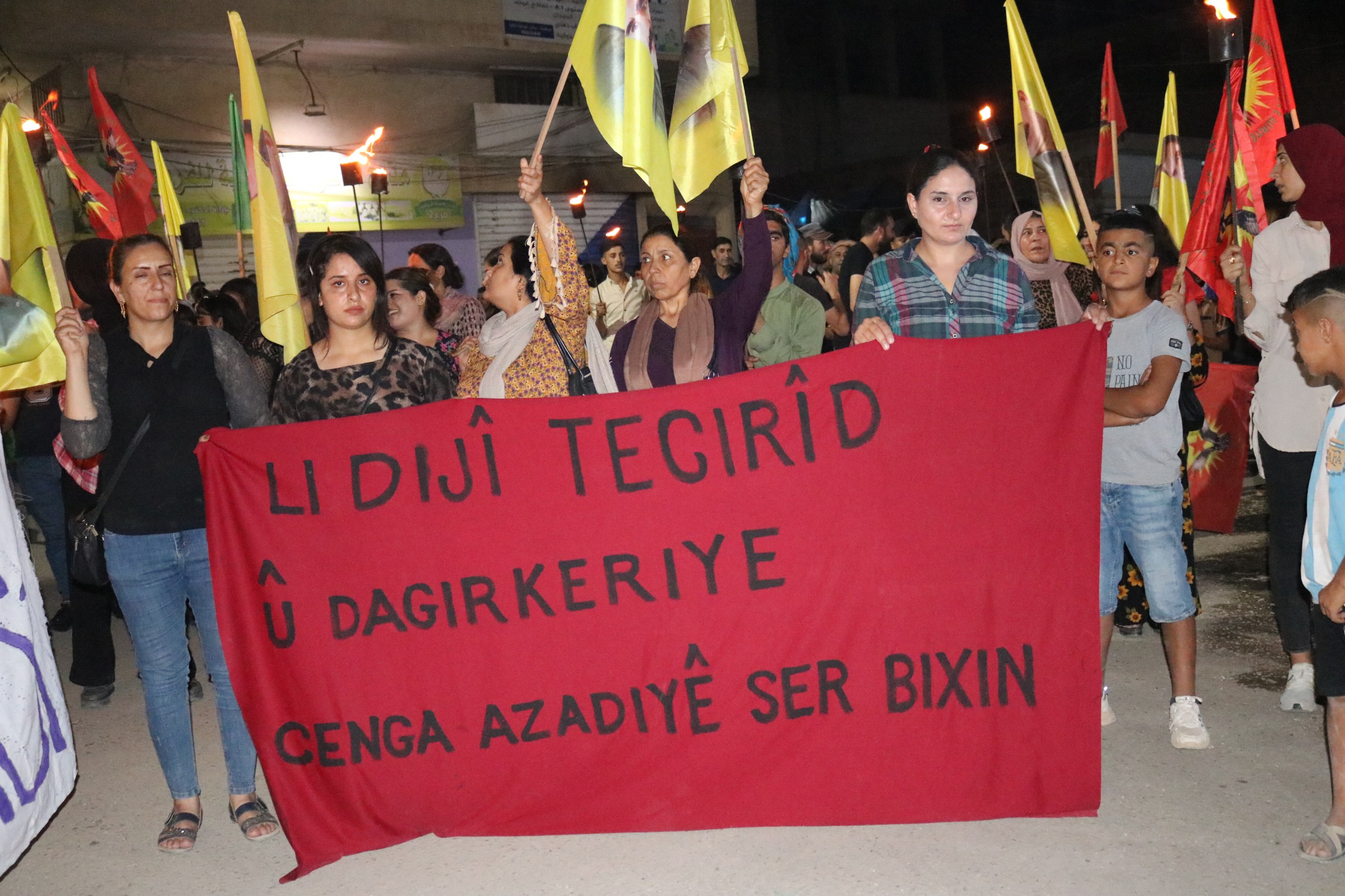 DIRBESIYÊ- Genç Kadınlar Birliği öncülüğünde “Jin Jiyan Azadî Serbixe Azadî” kampanyası çerçevesinde Dirbesiyê’de, Barzanî’nin ihanetine ve işbirliğine karşı meşaleli yürüyüş düzenlendi.