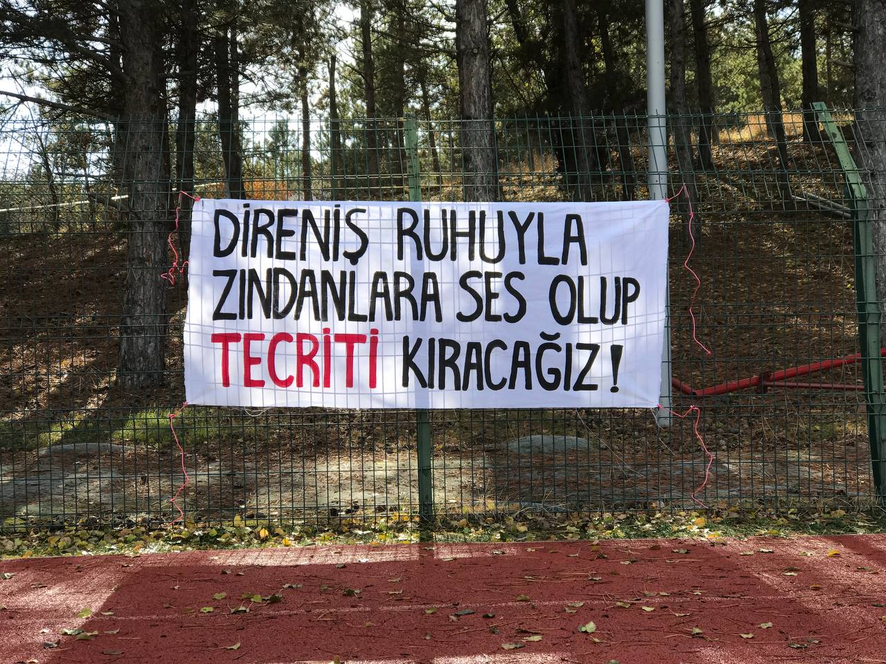 ANKARA- Ankara Demokratik Üniversite İnisiyatifi, zindanlarda siyasi tutsaklar tarafından yürütülen direnişe, ve mücadele destek vermek ve tecrit politikalarını protesto etmek amacıyla ODTÜ (Orta doğu Teknik Üniversitesi) kampüsünde üzerinde “Direniş Ruhuyla Zindanlara Ses Olup Tecridi Kıracağız” yazılı pankart asarak zindanlara yönelik uygulanan faşist politikalara dikkat çekti.