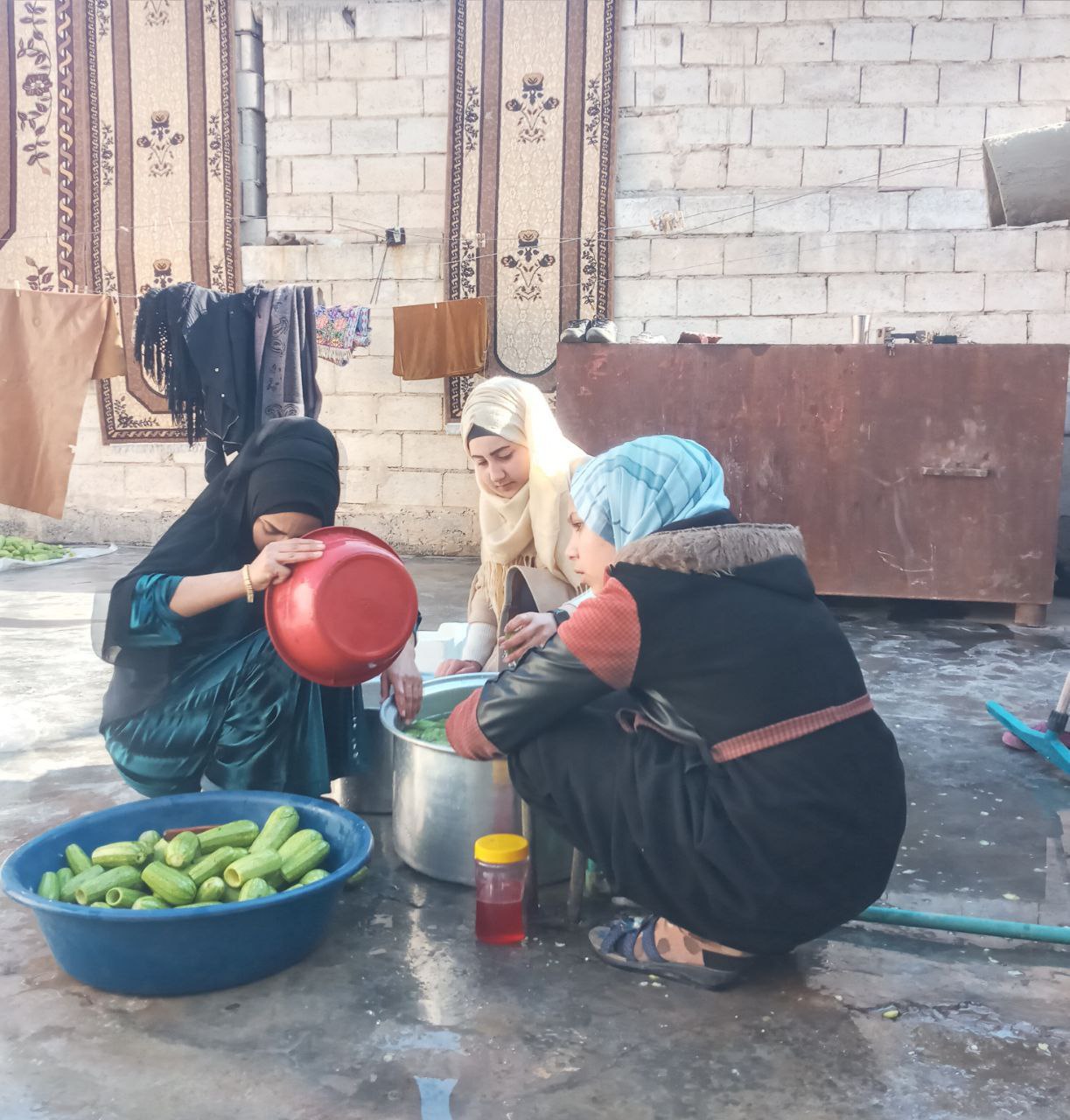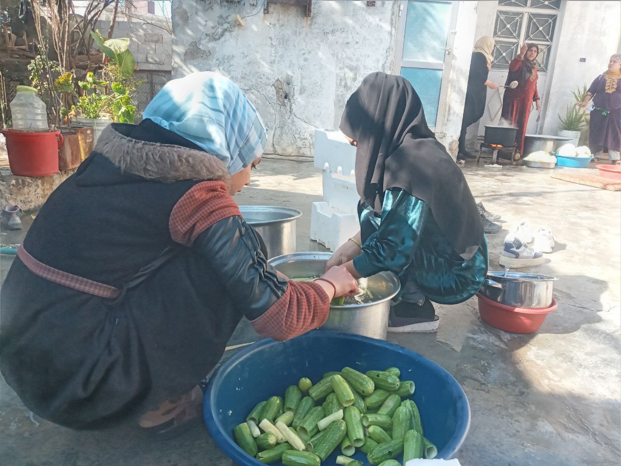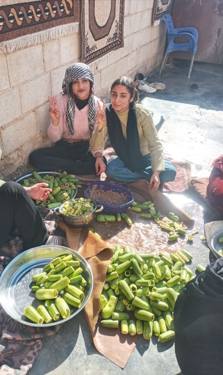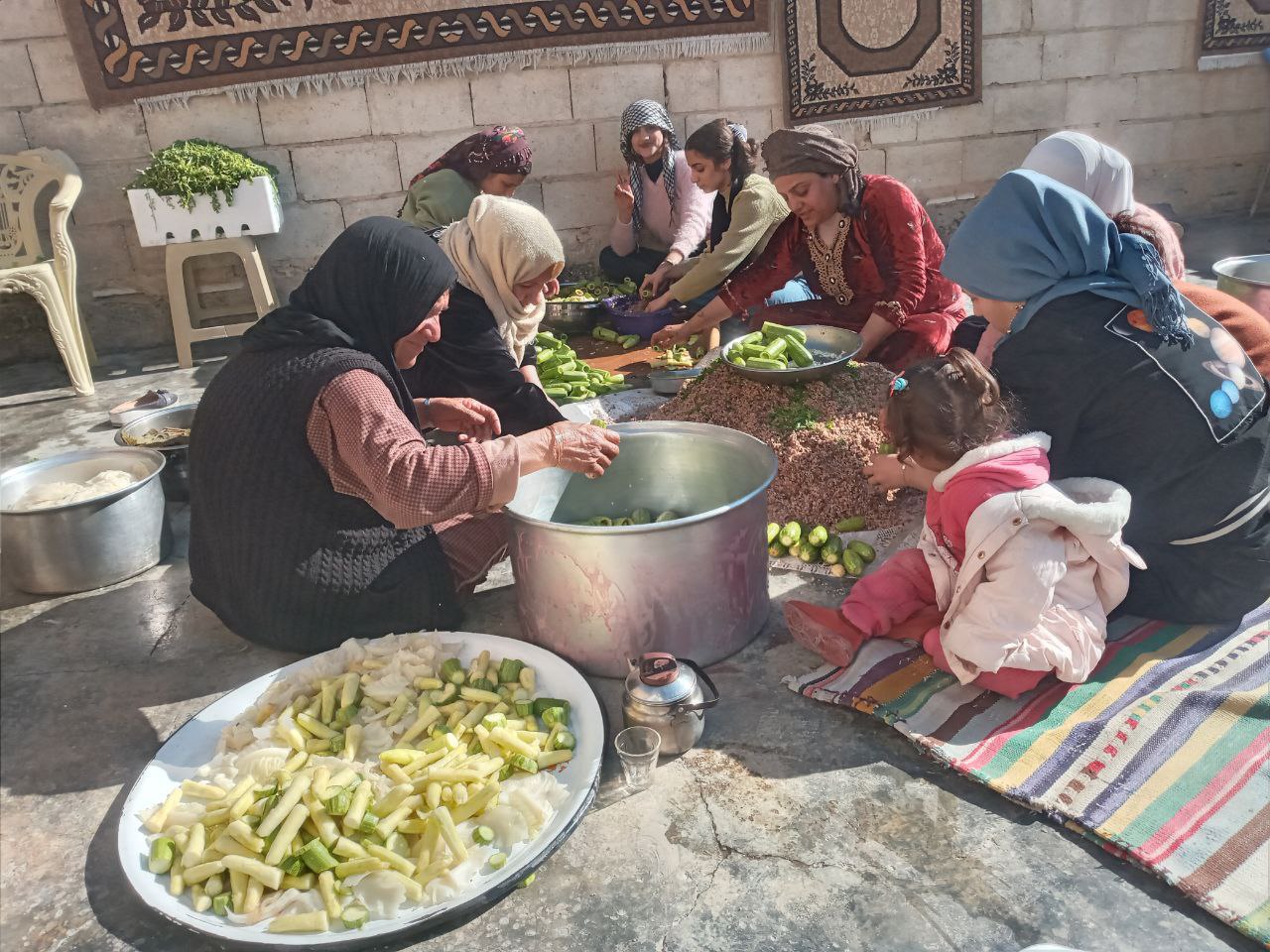 Tebqa’da bir grup genç kadınlar ve Tebqalı anneler, cephedeki savaşçılar için çeşit çeşit yemek hazırlıyor.