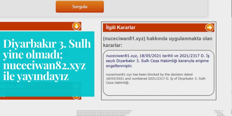 nuceciwan81.xyz, 18/05/2021 tarihli ve 2021/2317 D. İş sayılı Diyarbakır 3. Sulh Ceza Hakimliği kararıyla erişime engellenmiştir.