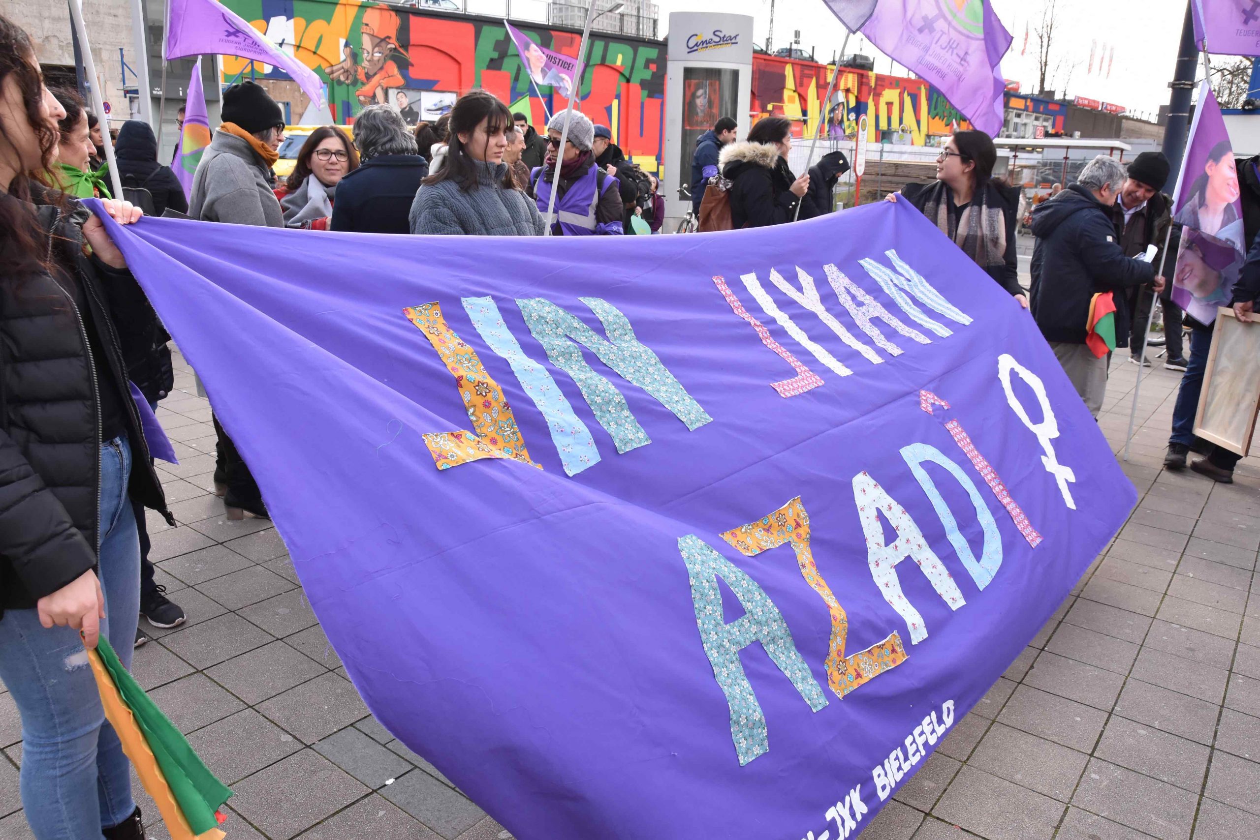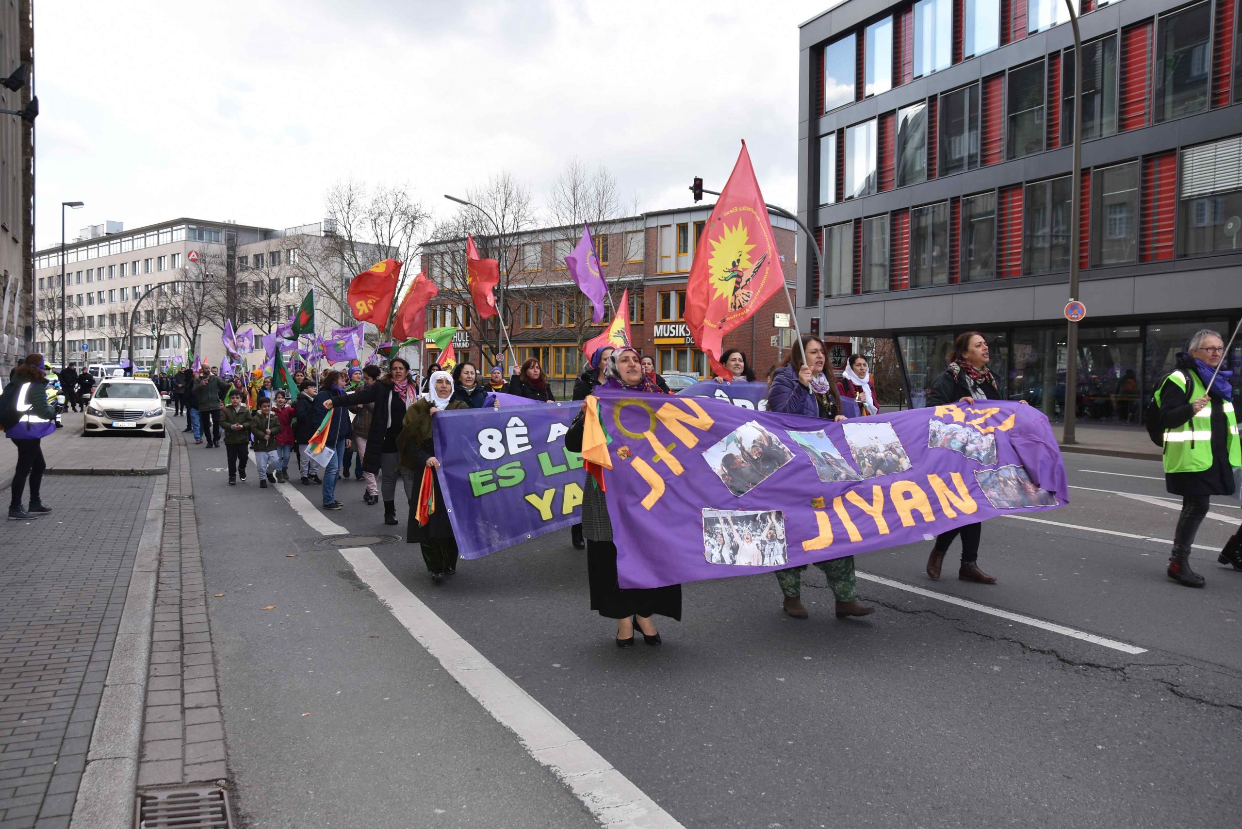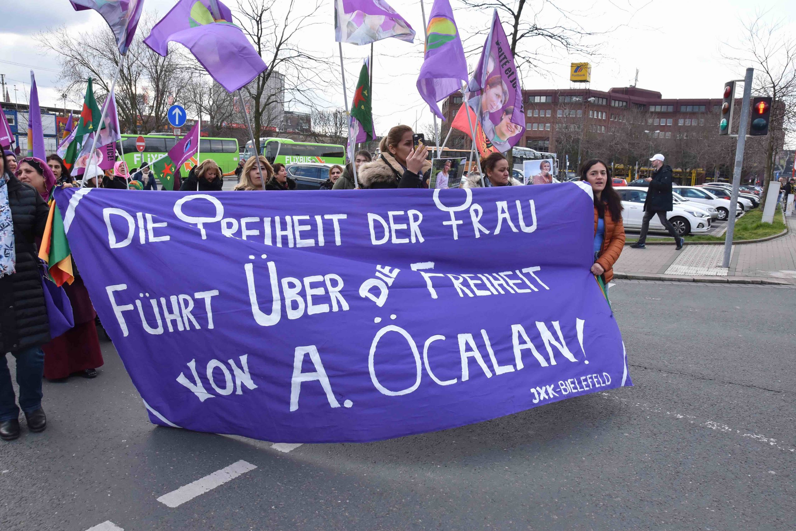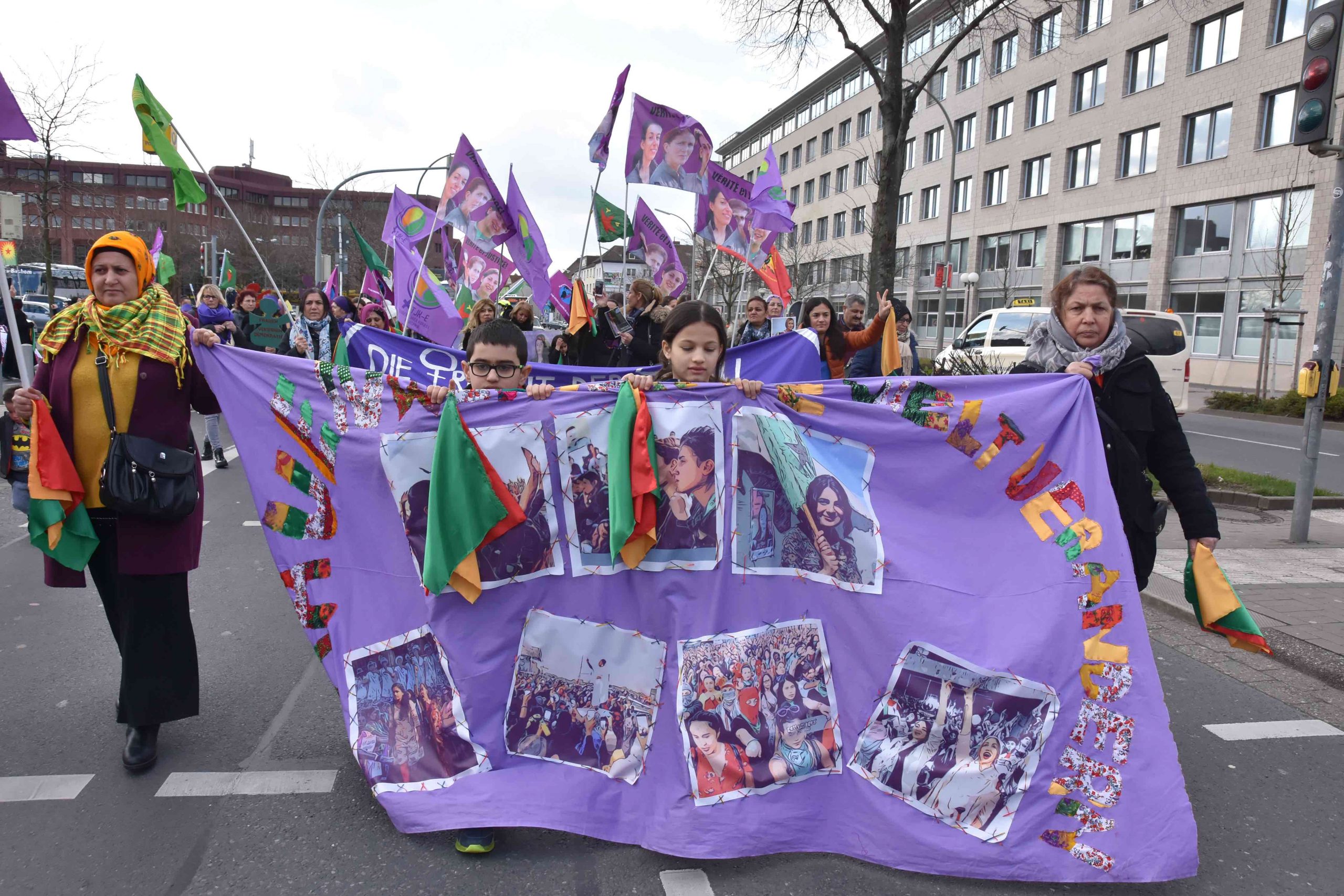 Yüzlerce kadının katıldığı yürüyüşte günün önemini anlatan Almanca bildiriler dağıtılırken, elle yapılan pankartlar dikkat çekti. Eylemciler, “Kadının özgürlüğü Öcalan’ın özgürlüğünden geçer”, “Kadınlar dünyayı değiştiriyor” ve “Jin Jiyan Azadî” yazılı pankartlar taşırken, Almanca ve Kürtçe “8 Mart” yazılı mor fularlar taktılar.