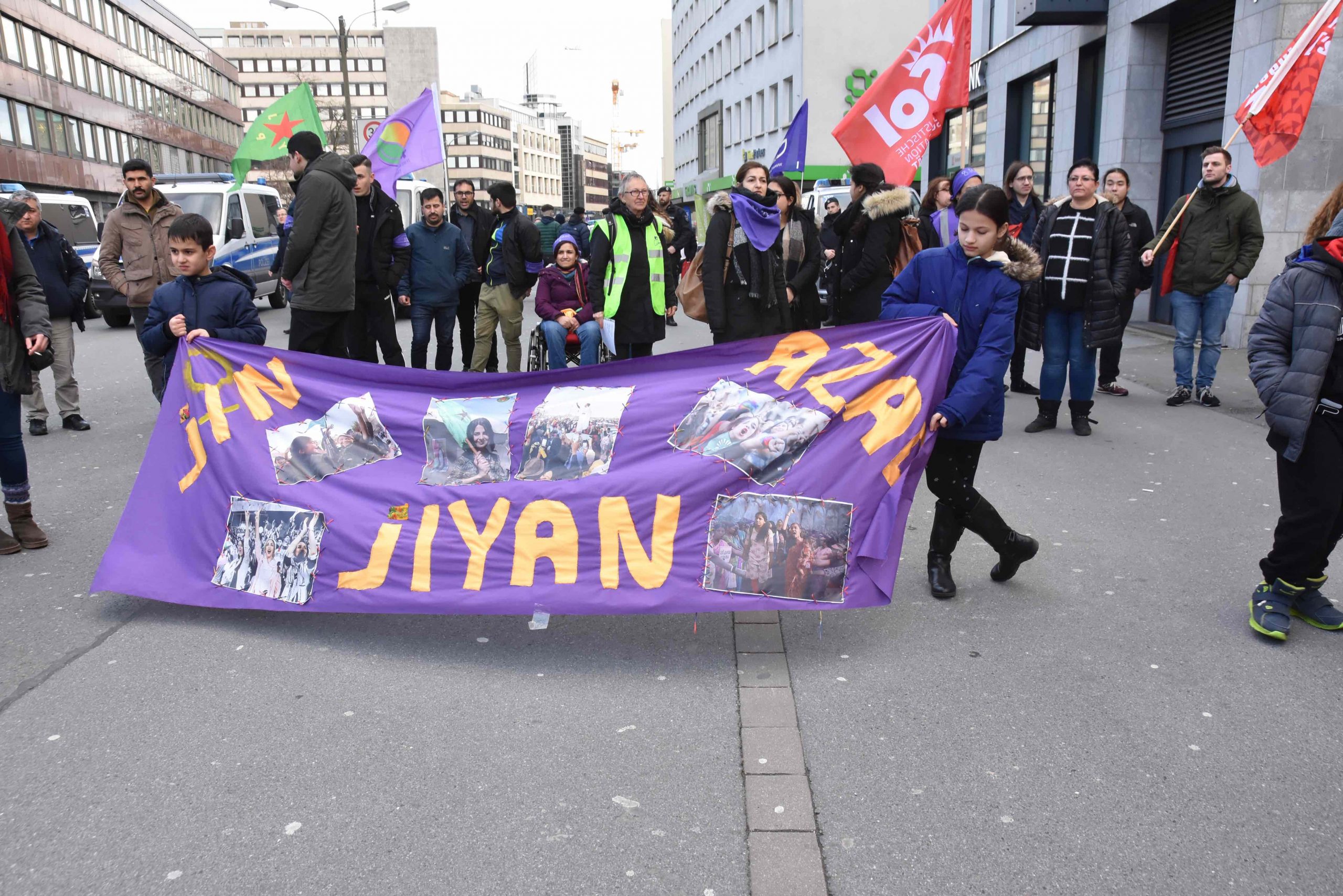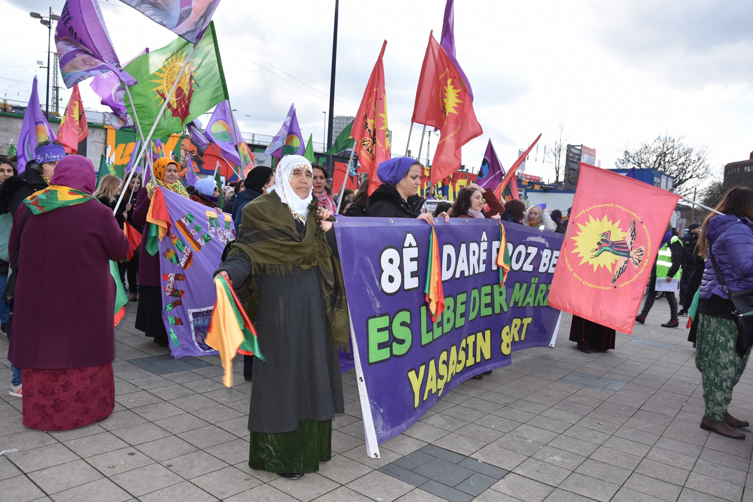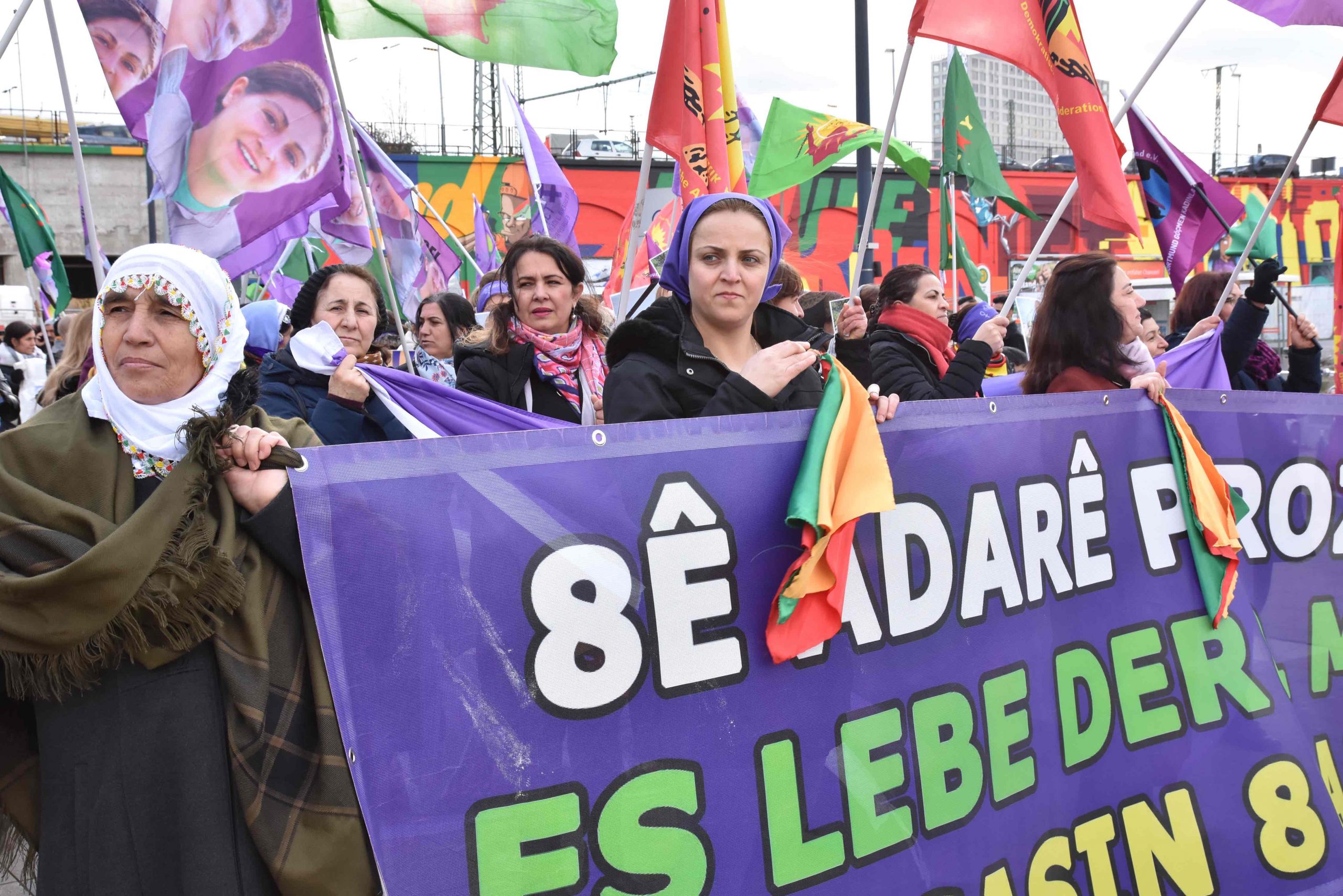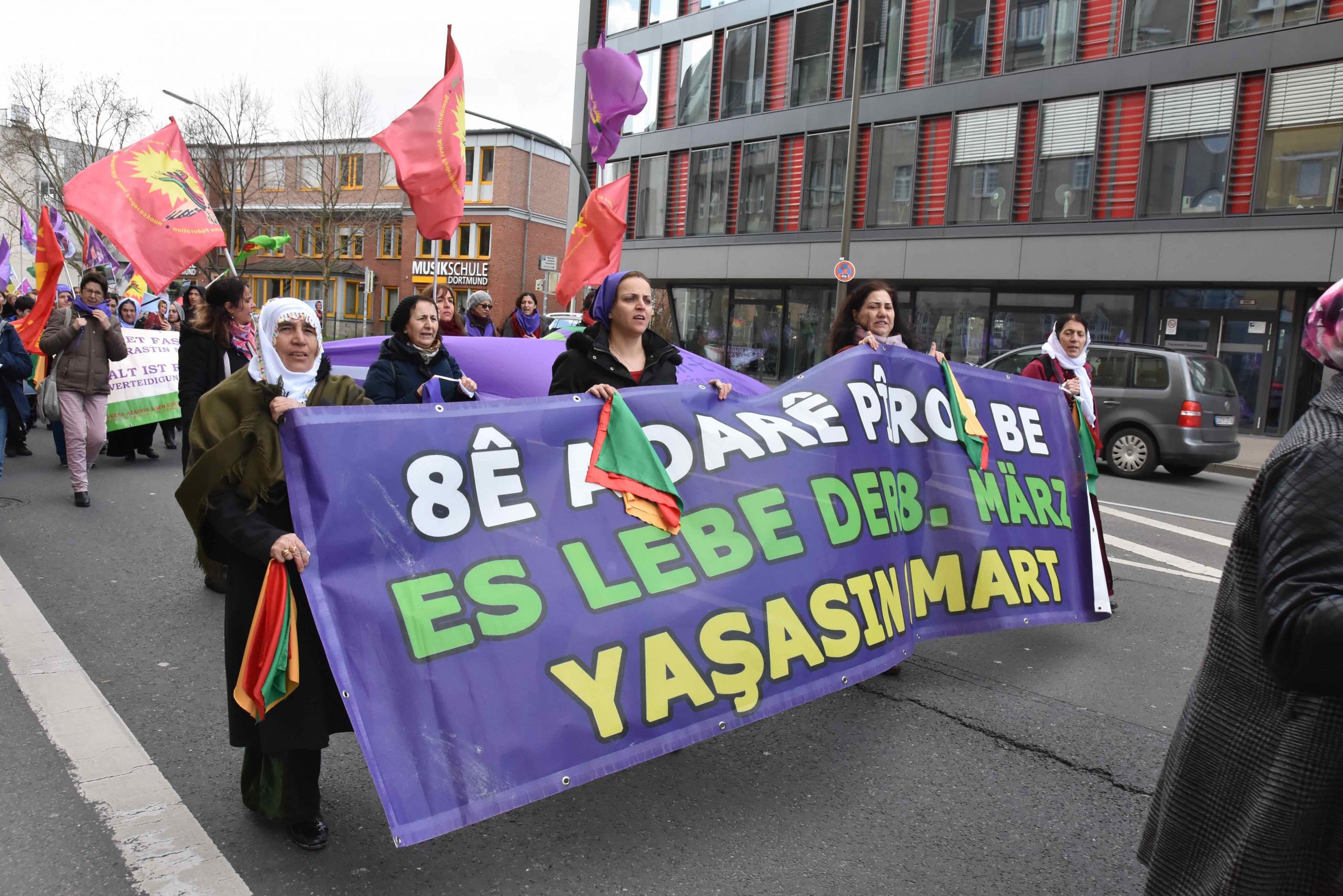 Yüzlerce kadının katıldığı yürüyüşte günün önemini anlatan Almanca bildiriler dağıtılırken, elle yapılan pankartlar dikkat çekti. Eylemciler, “Kadının özgürlüğü Öcalan’ın özgürlüğünden geçer”, “Kadınlar dünyayı değiştiriyor” ve “Jin Jiyan Azadî” yazılı pankartlar taşırken, Almanca ve Kürtçe “8 Mart” yazılı mor fularlar taktılar.