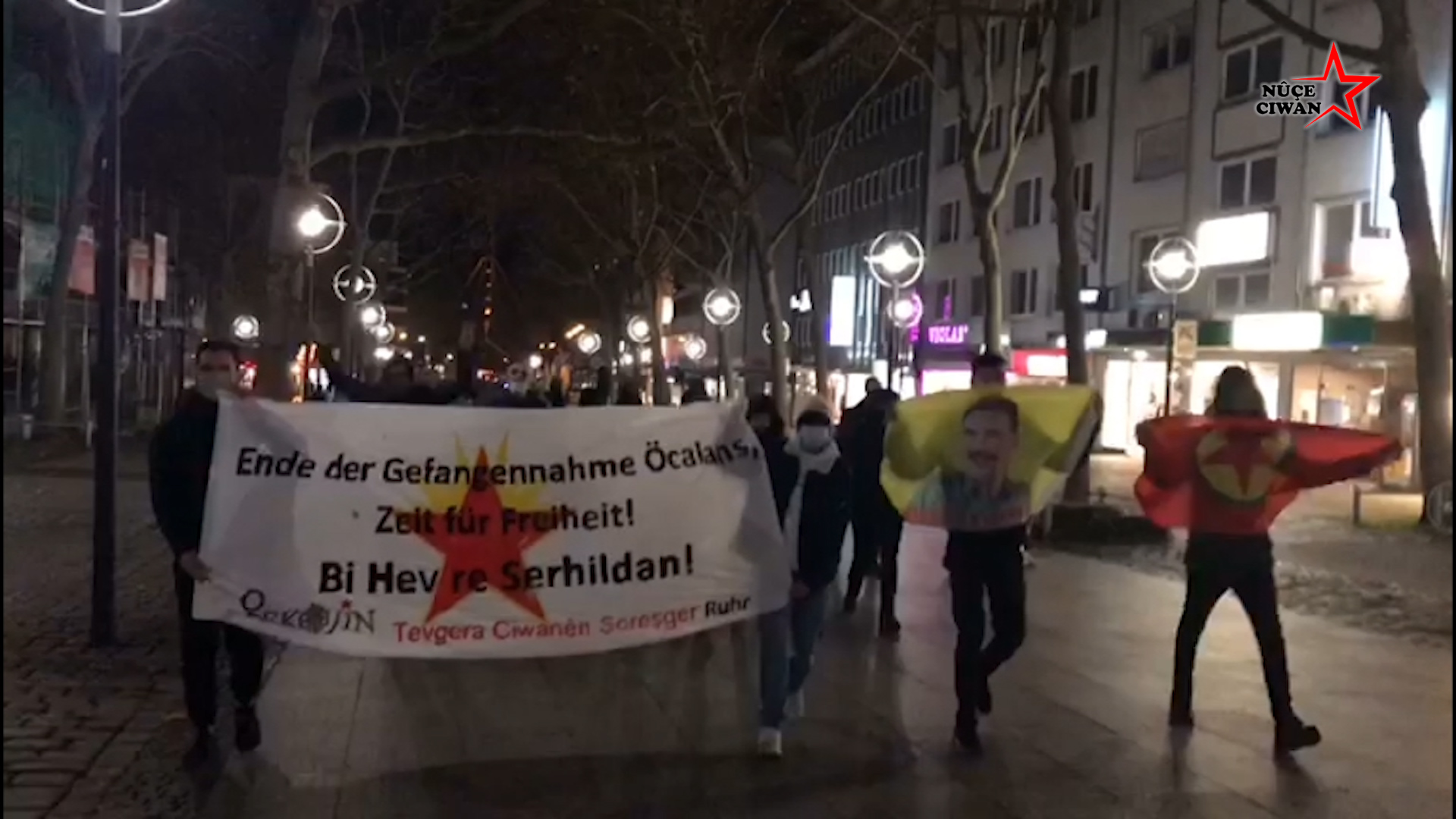 Gençler son olarak ise akşam saatlerinde Önder Öcalan’ın fiziki özgürlüğü hedefiyle bir yürüyüş gerçekleştirdi. Yaklaşık 25 gencin katıldığı yürüyüşte Almanca, “Öcalan’a tecrid sona ermeli – Şimdi Özgürlük Zamanı” ve “Bi Hev Re Serhildan” yazılı pankart taşındı. PKK ve Halklar Önderi Abdullah Öcalan’ın bayrak ve posterlerinin yasak olmasını kabul etmeyen gençler, eylemde Önder Öcalan’ın posterlerini ve PKK bayraklarını da açtı.