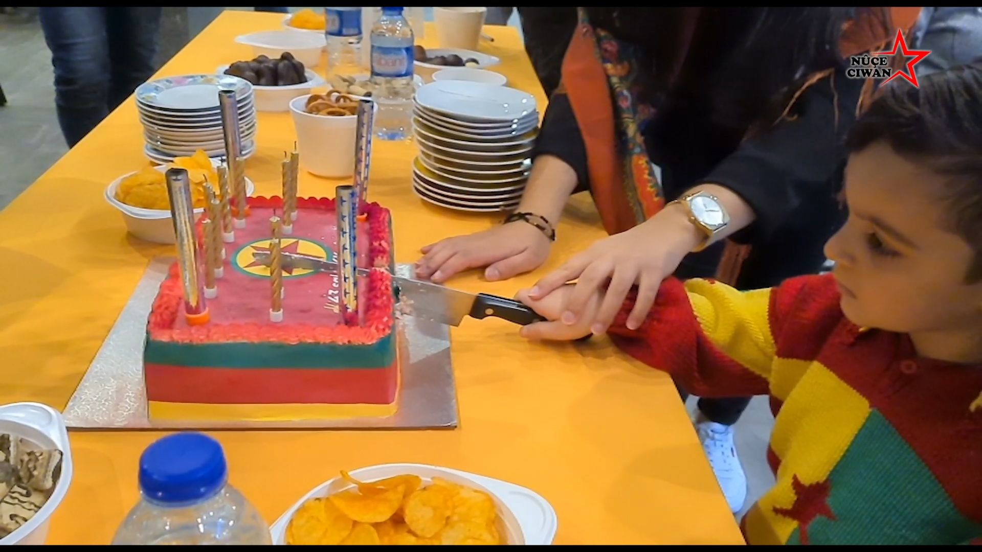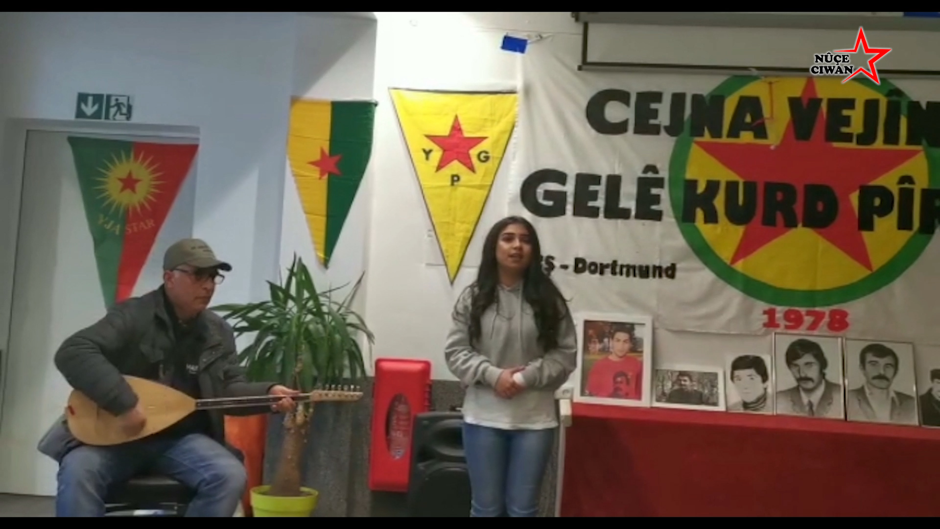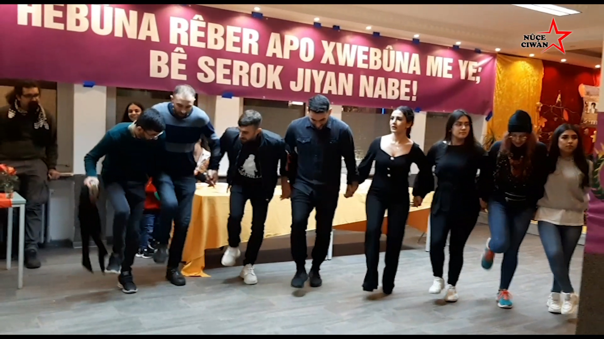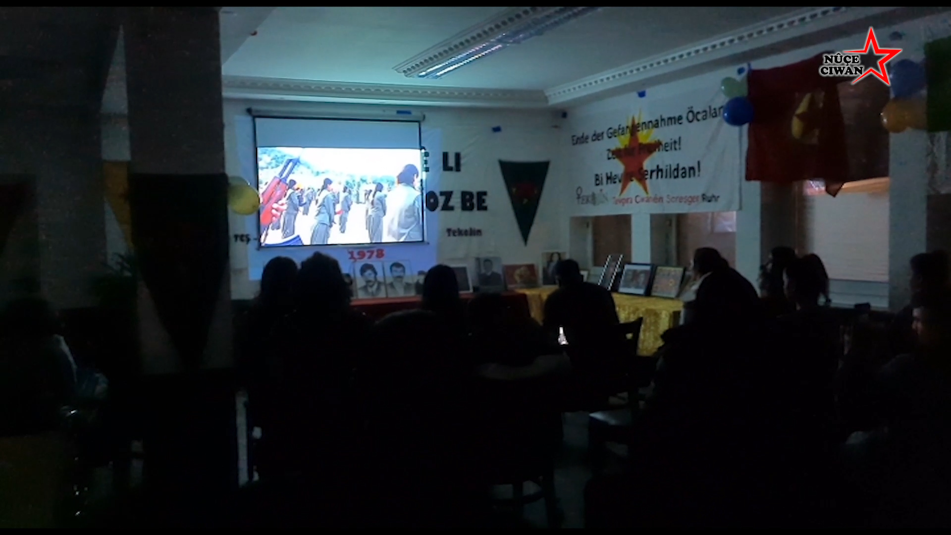 “Cejna Vêjînê Li Gelê Kurd Pîroz Be”, “Ende der Gefangennahme Öcalans, Zeit für Freiheit – Bi Hev Re Serhildan” pankartları ve Özgürlük Mücadelesi şehitlerinin posterlerinin yer aldığı salonda gençler etkinliğe başlamadan önce devrim şehitleri anısına saygı duruşunda bulundu. Saygı duruşu sonrası 43’ncü yıl vesilesiyle hazırlanan sinevizyon izlendi.