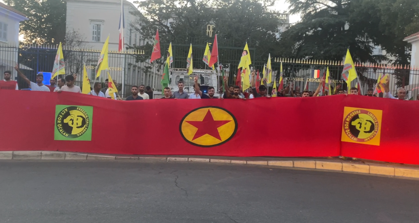 Draguignan'da TCŞ üyesi gençler öncülüğünde Rojava Devrimi ‘nin yıldönümünü kutlamak ve Faşist Akp-mhp iktidarının Önder APO üzerinden pazarlık konusu yapmaya çalışmasını protesto etmek için yürüyüş düzenlendi.