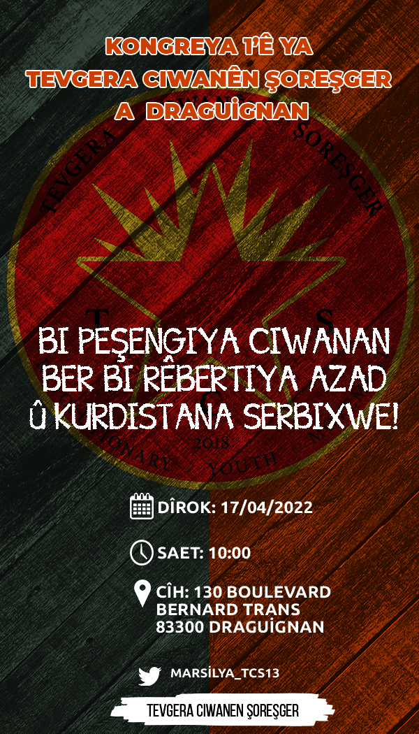 HABER MERKEZİ – Fransa’nın Draguignan kentinde Tevgera Ciwanen Şoreşger (TCŞ) aktivistleri, “Bi peşengiya ciwanan ber bi Rêbertiya azad û Kurdistana serbixwe!” şiarı ile “Werin Cenga Azadiyê” hamlesi kapsamında gerçekleştirecekleri 1. Olağan Kongrelerine ilişkin bir çağrıda bulundu.