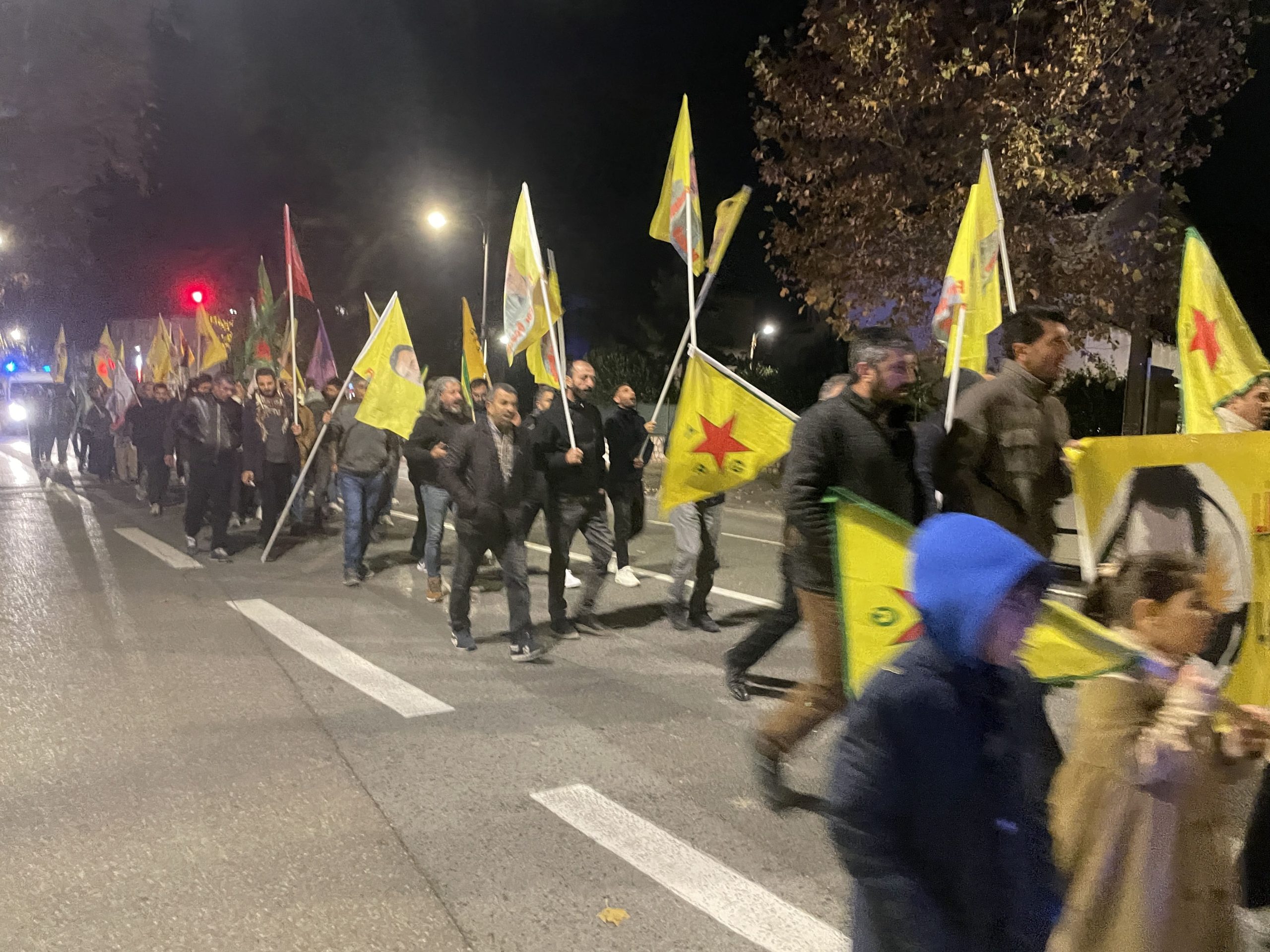 Yürüyüşte sık sık Rojava’ya yönelik saldırılara karşı Kürtçe, Fransızca ve Türkçe bilgilendirme konuşmaları yapıldı ve “Bijî Serok APO”, “Bê Serok Jiyan Nabe” ve “Bijî Berxwedana Rojava” sloganları atıldı.
