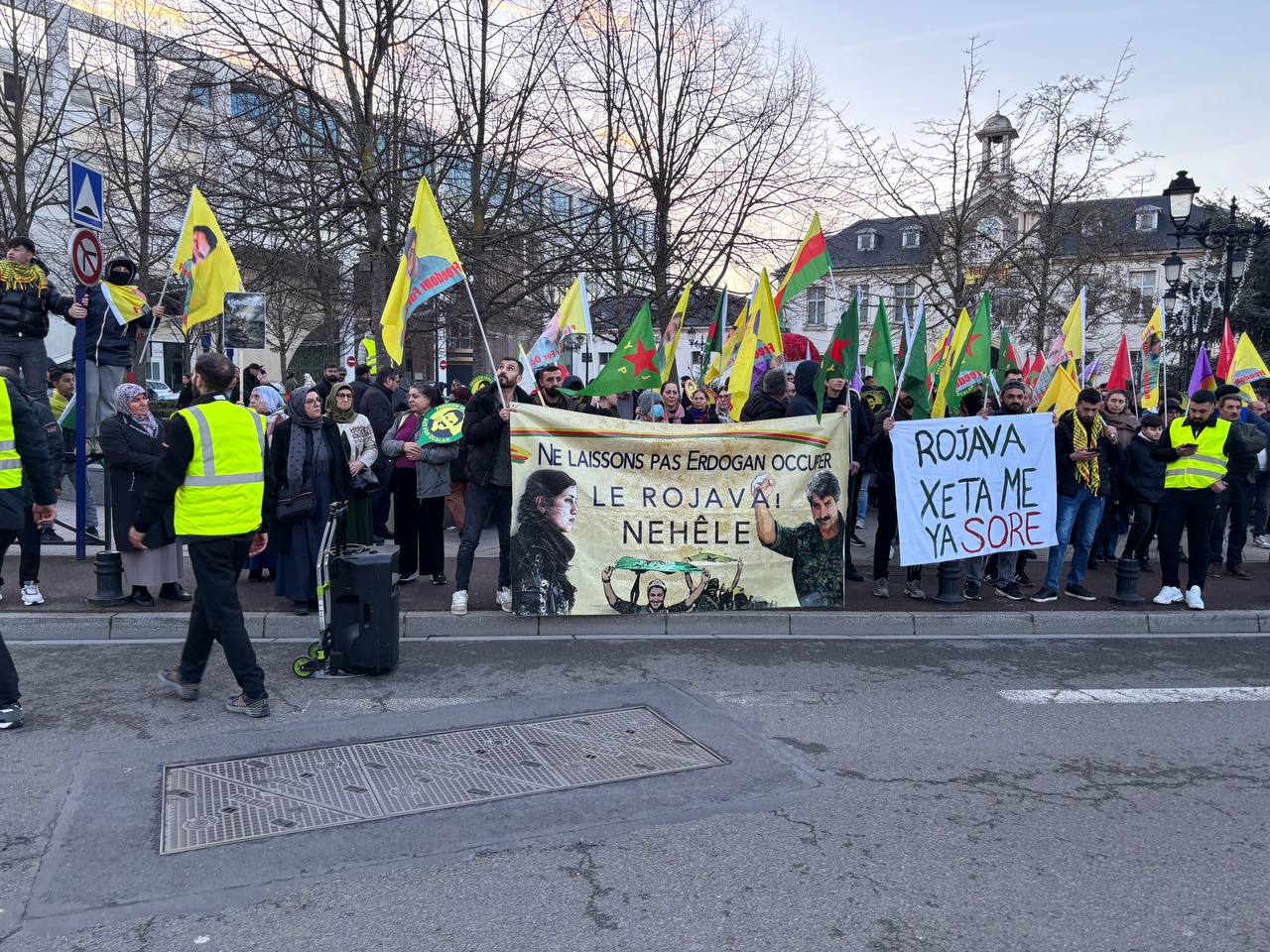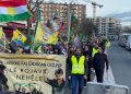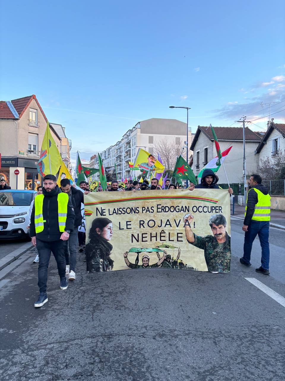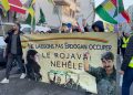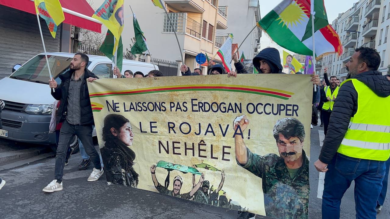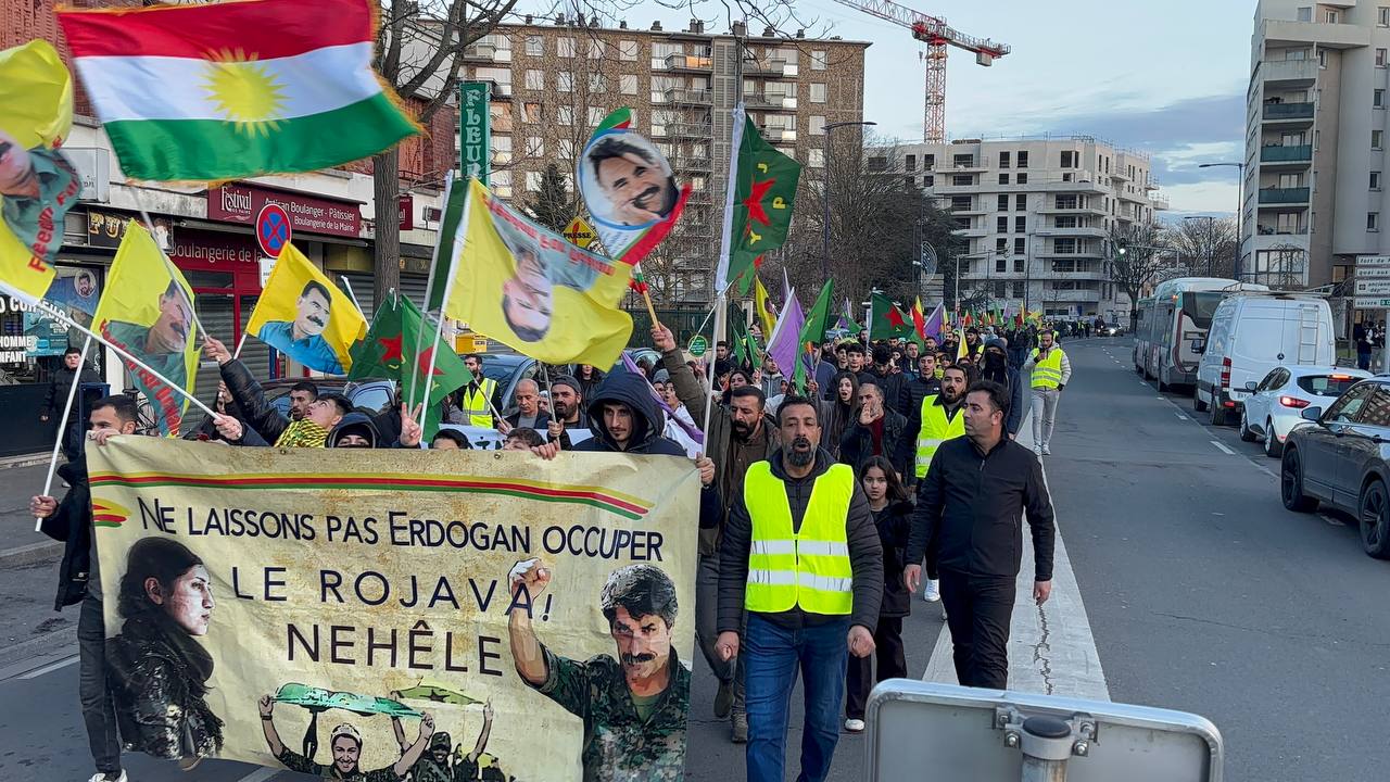 Önder APO ve YPJ bayraklarıyla yürüyen kitle, Rojava’nın Kürt halkının kırmızı çizgisi olduğuna vurgu yaparak “Bijî Berxwedana Rojava”, “Bijî Serok APO” sloganlarıyla Drancy sokaklarını Kürt halkının direniş ruhuyla doldurdu.
