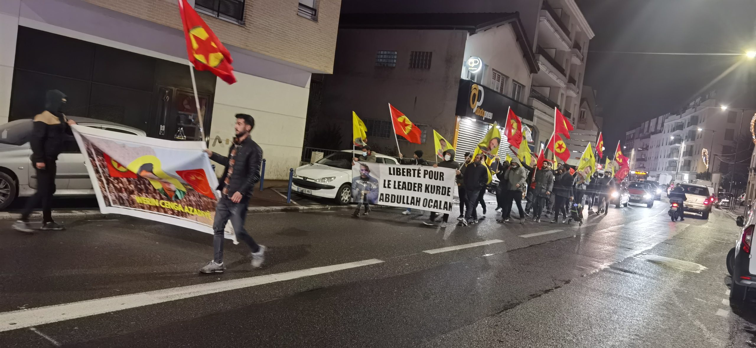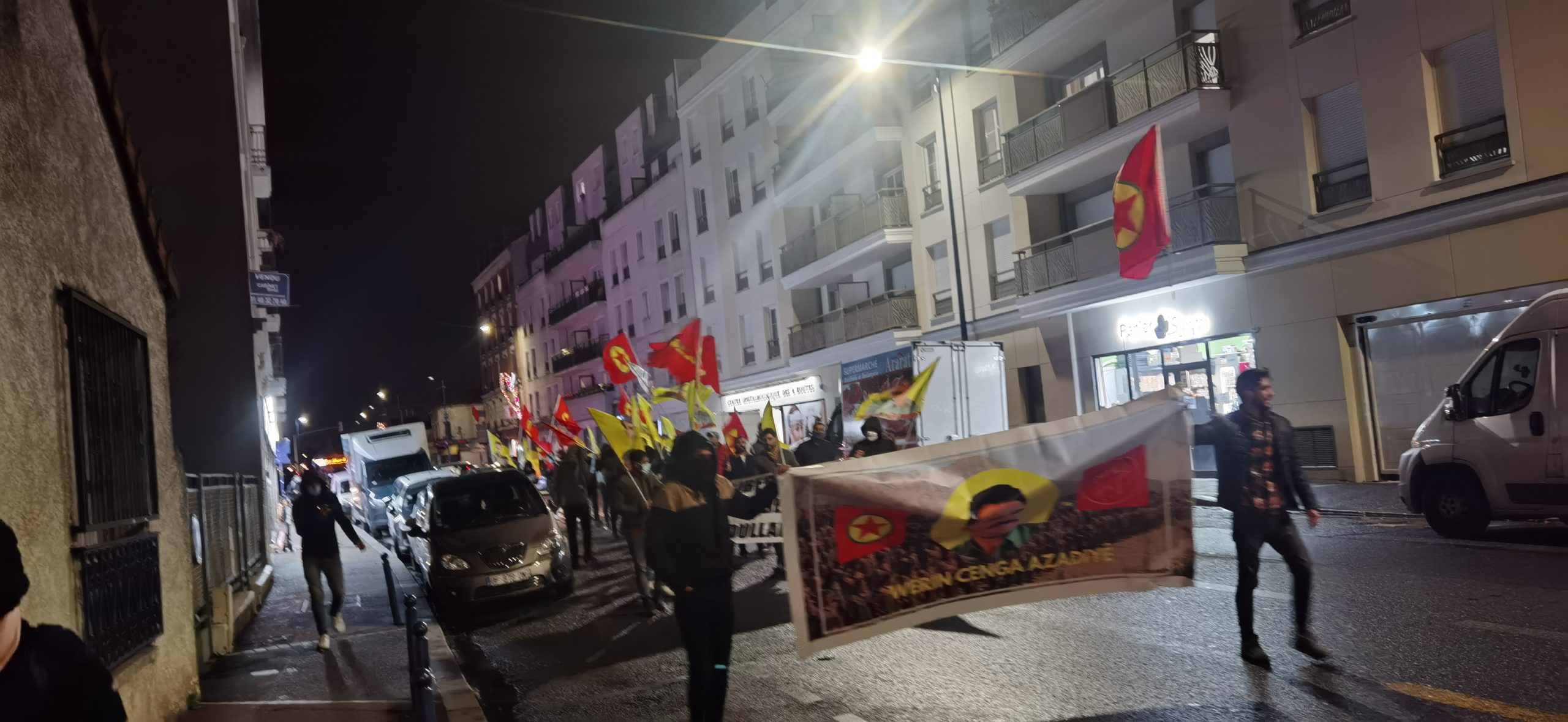 Önder Öcalan bayrakları ve Werin Cenga Azadiyê pankartı taşıyan gençler, sık sık “Assassin Erdogan (Katil Erdoğan)”, “A Bas Le Régime Fasciste En Turquie (Kahrolsun Faşist Türk Rejimi)”, “Bijî Serok APO” ve “Bijî Berxwedana Gerîla” sloganları attılar.