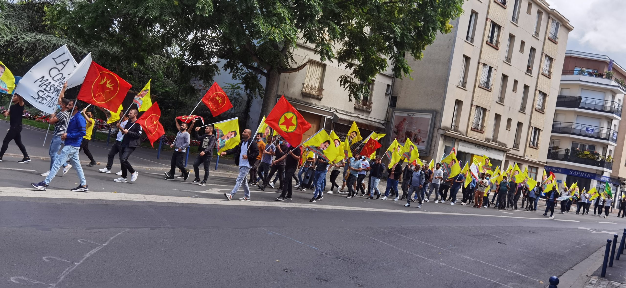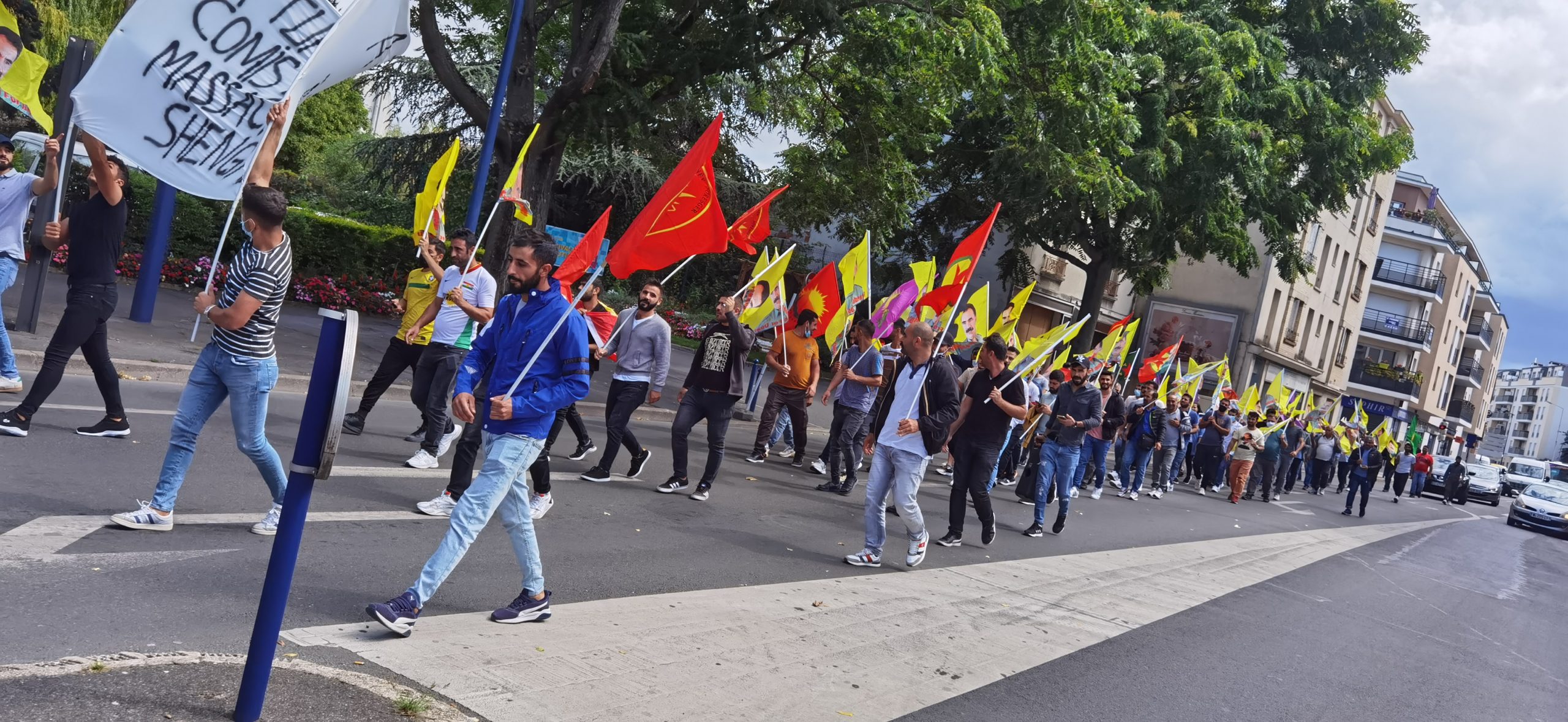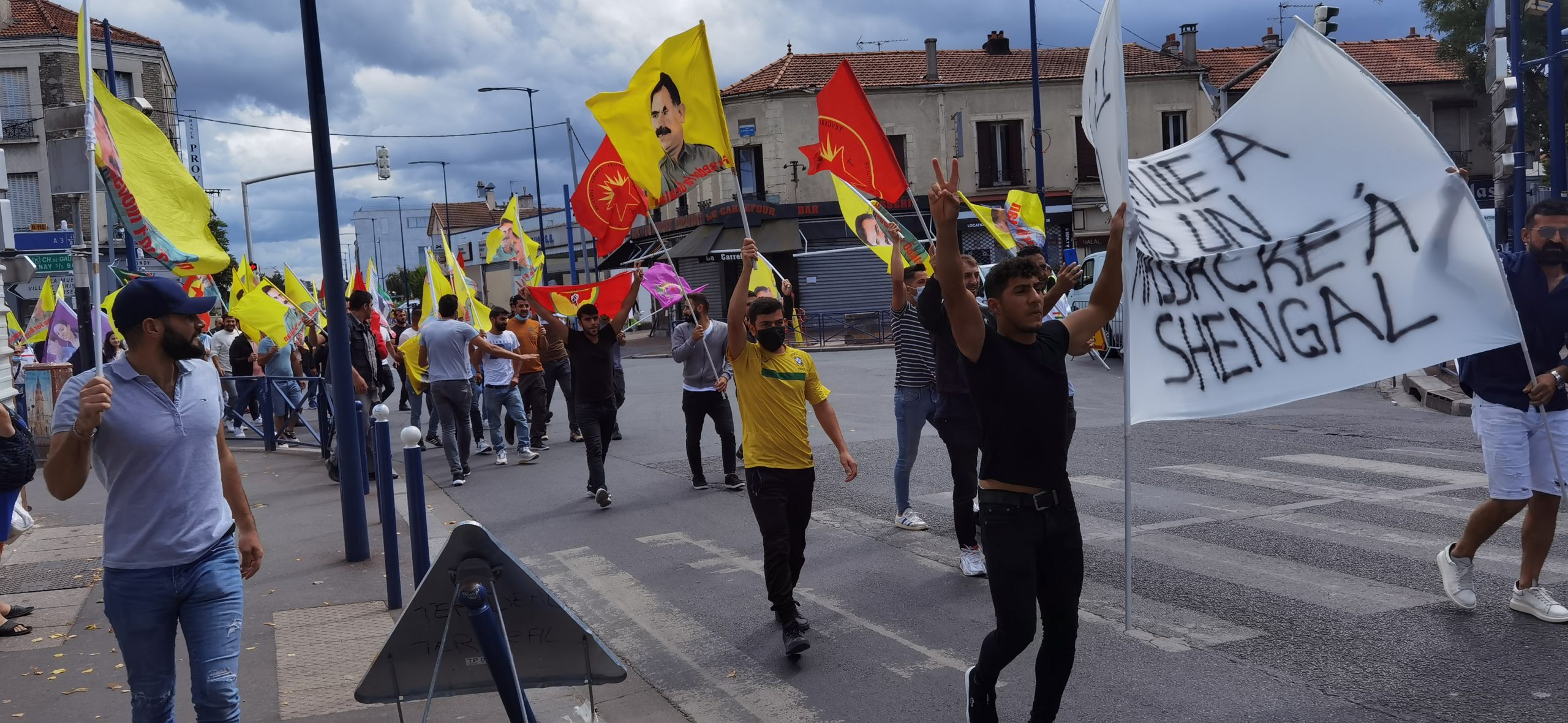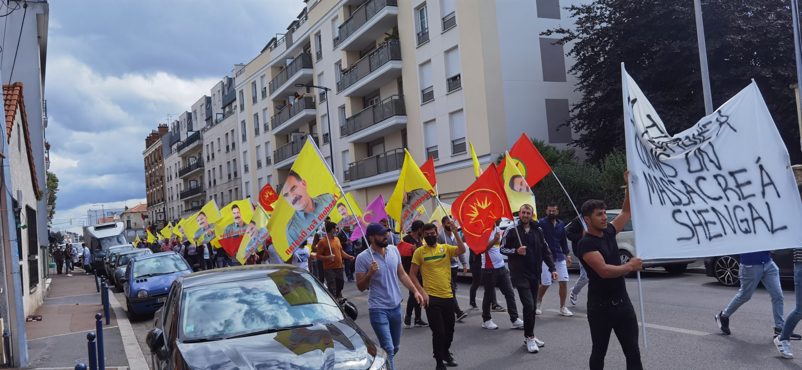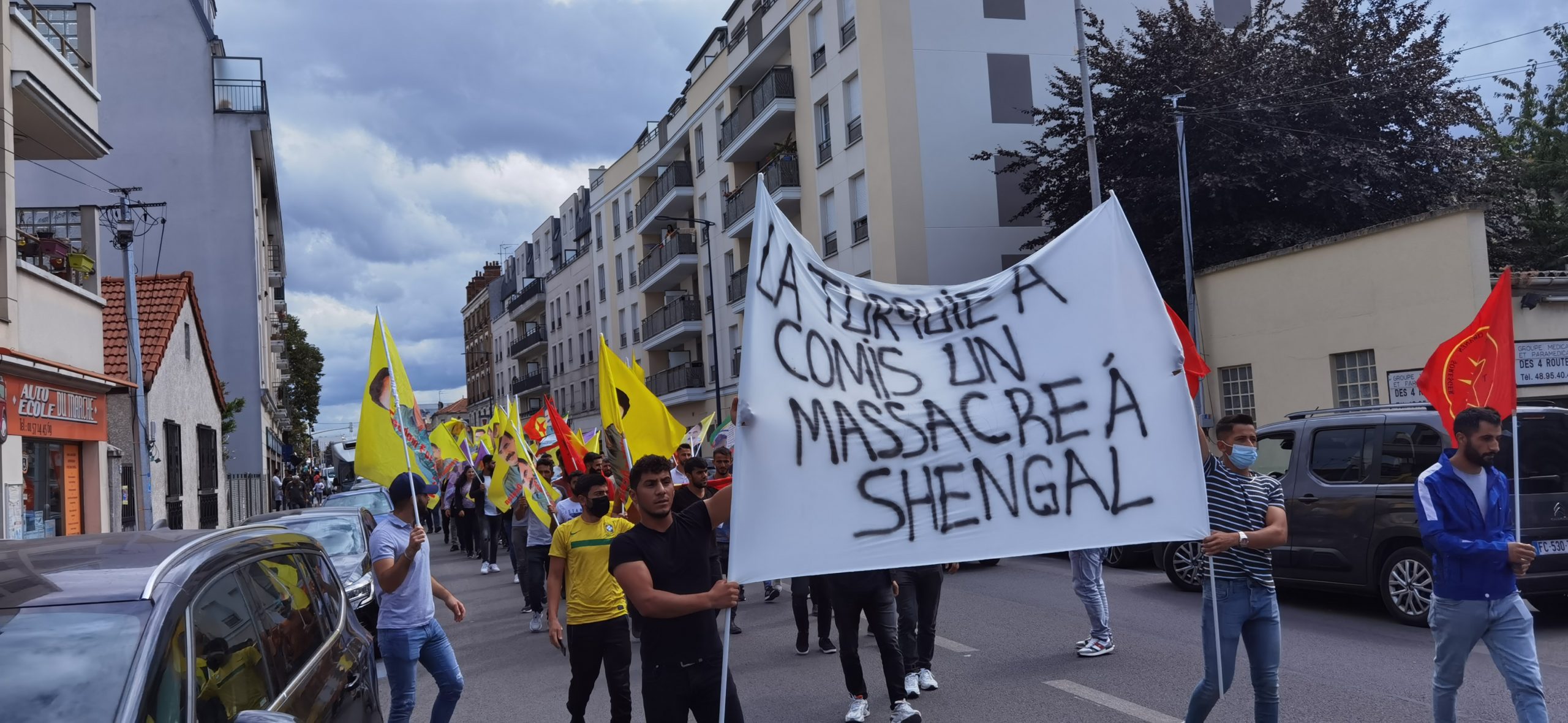 DRANCY – Saat 14:00’da bir araya gelen kitle üzerinde Fransızca “la Turquie a commis un massacre a Shengal (Türkiye Şengal’de katliam yapıyor) yazılı bir pankartla yürüyüş gerçekleştirdi.