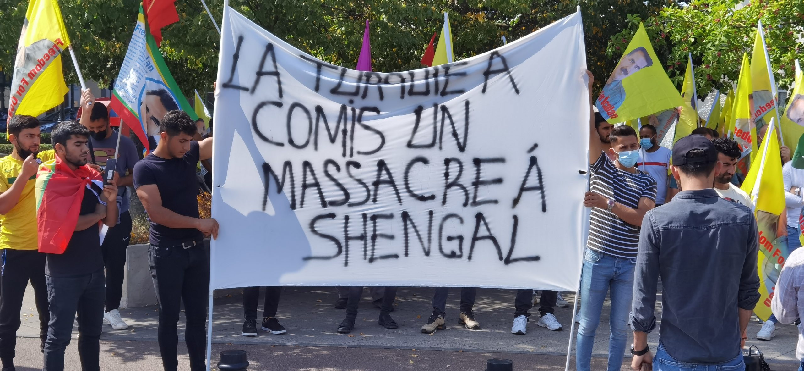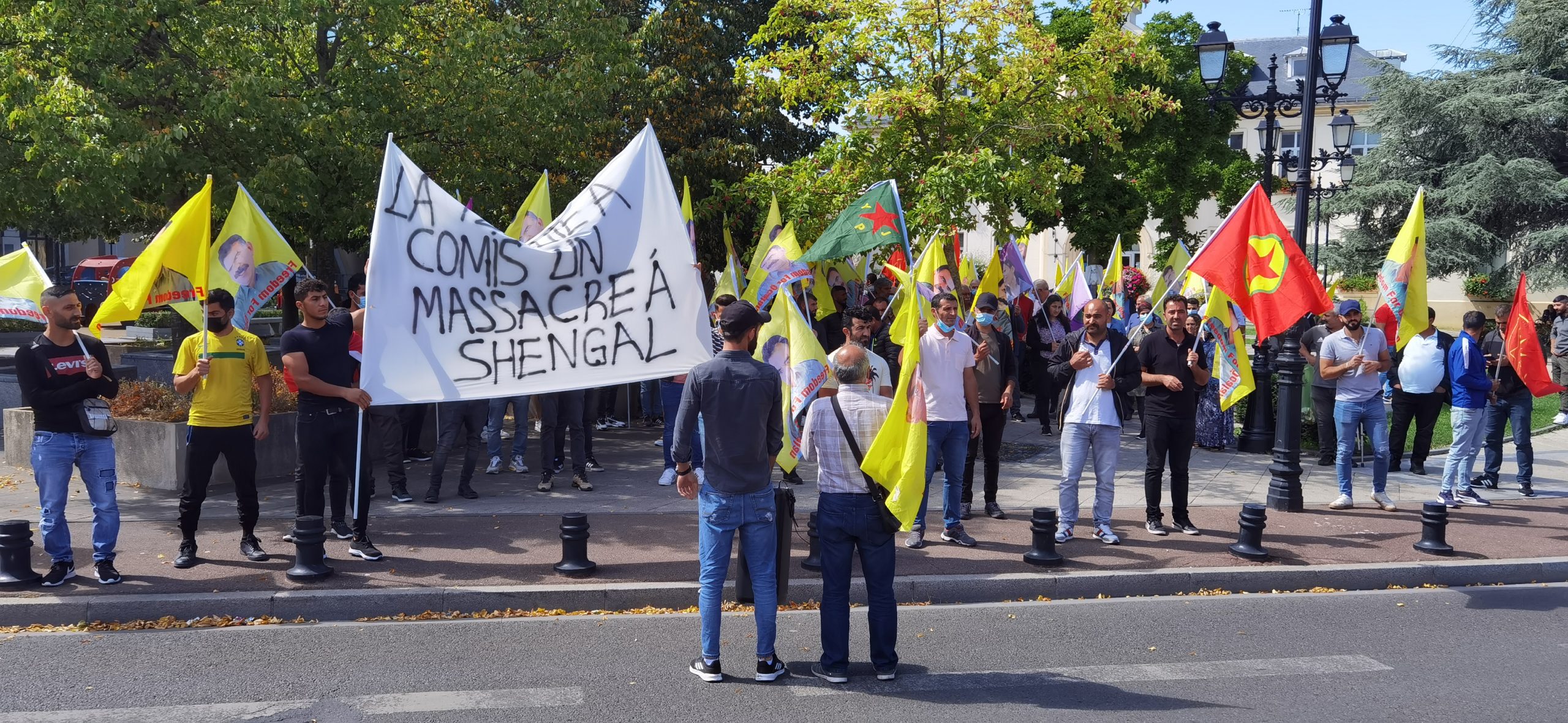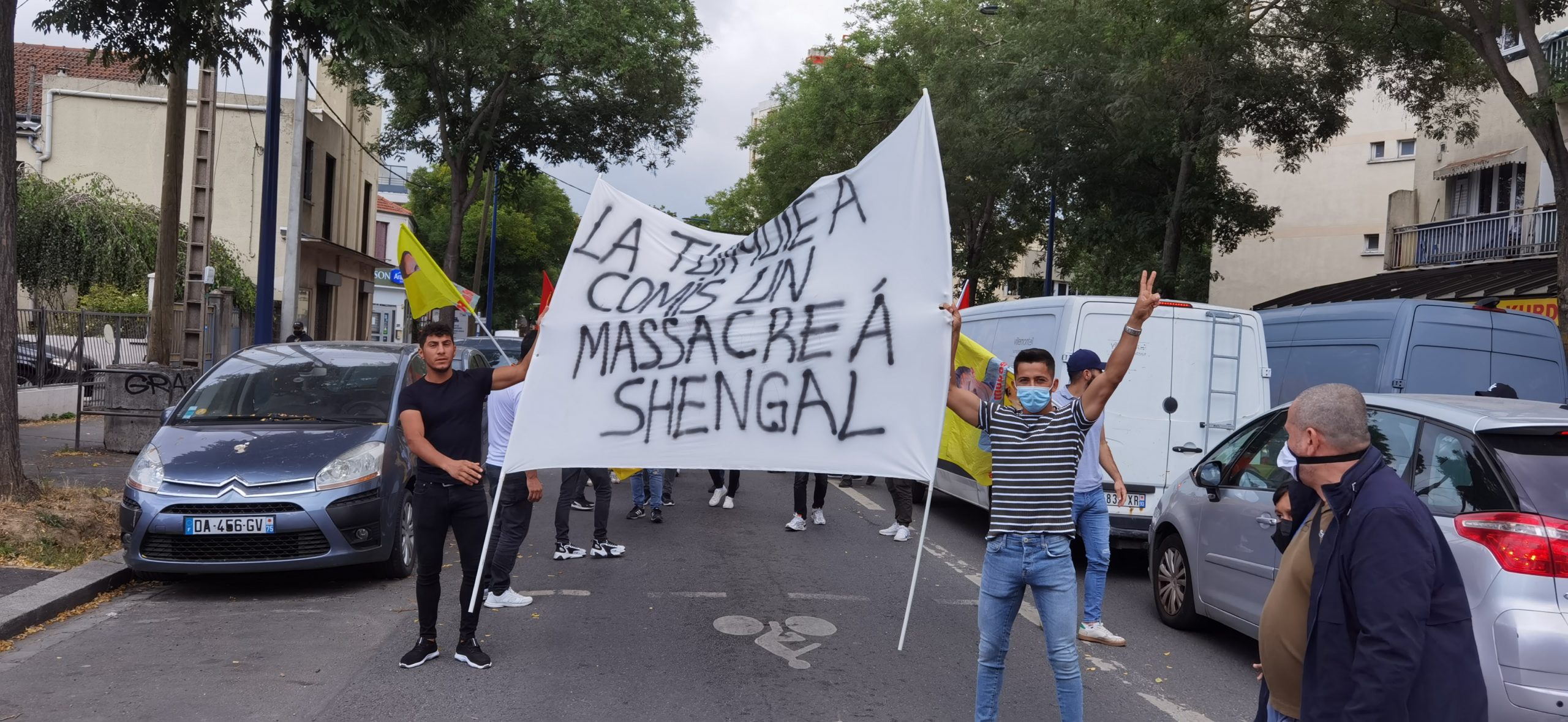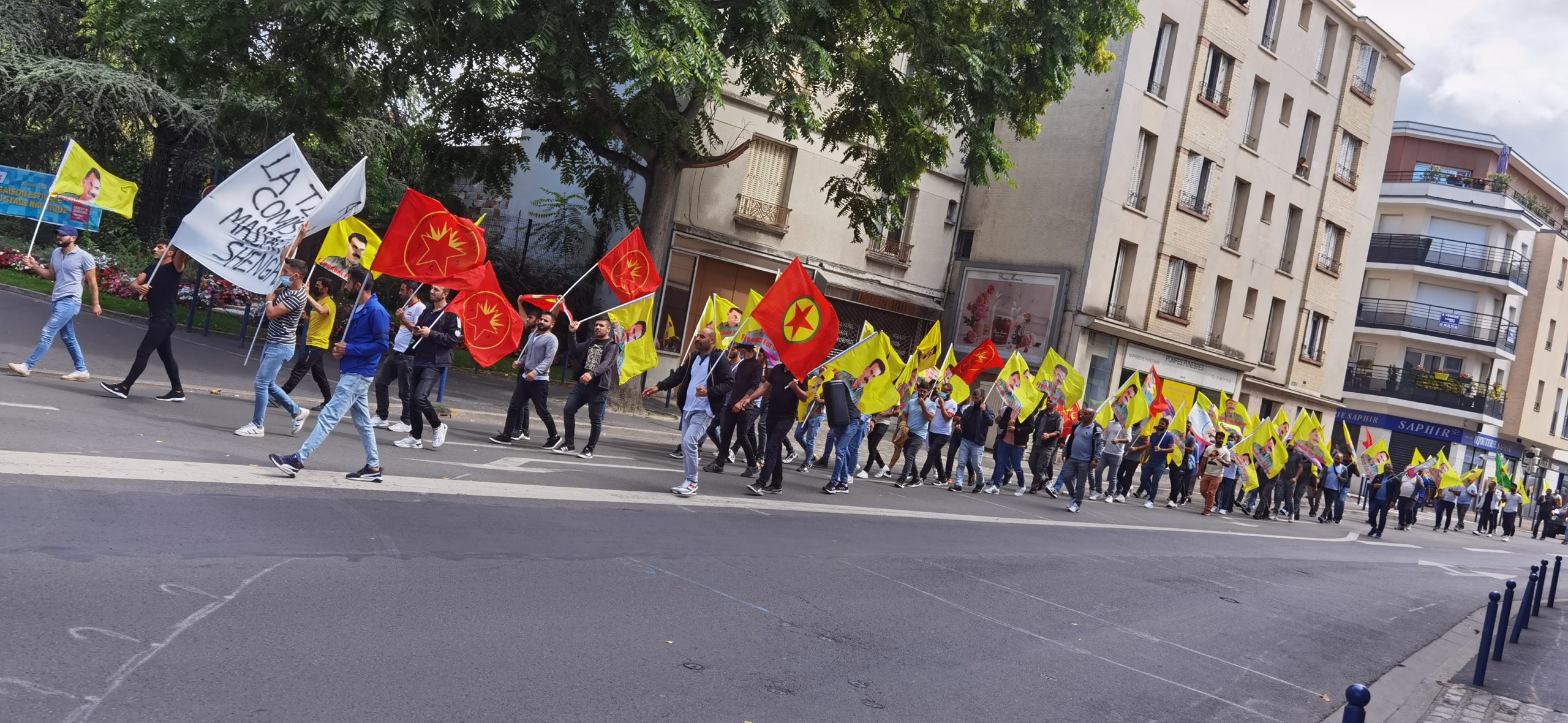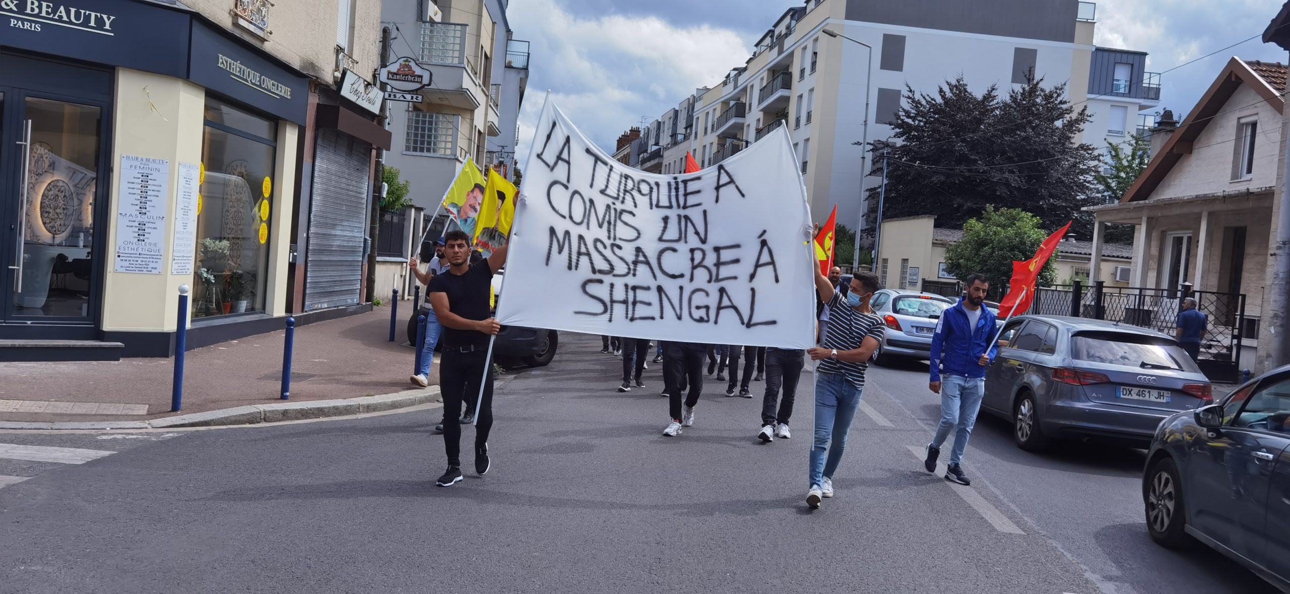 DRANCY – Saat 14:00’da bir araya gelen kitle üzerinde Fransızca “la Turquie a commis un massacre a Shengal (Türkiye Şengal’de katliam yapıyor) yazılı bir pankartla yürüyüş gerçekleştirdi.