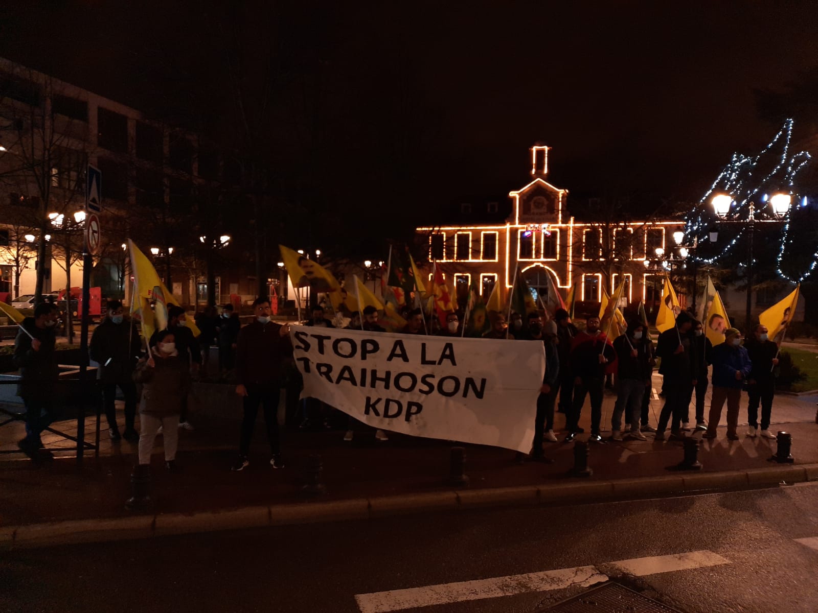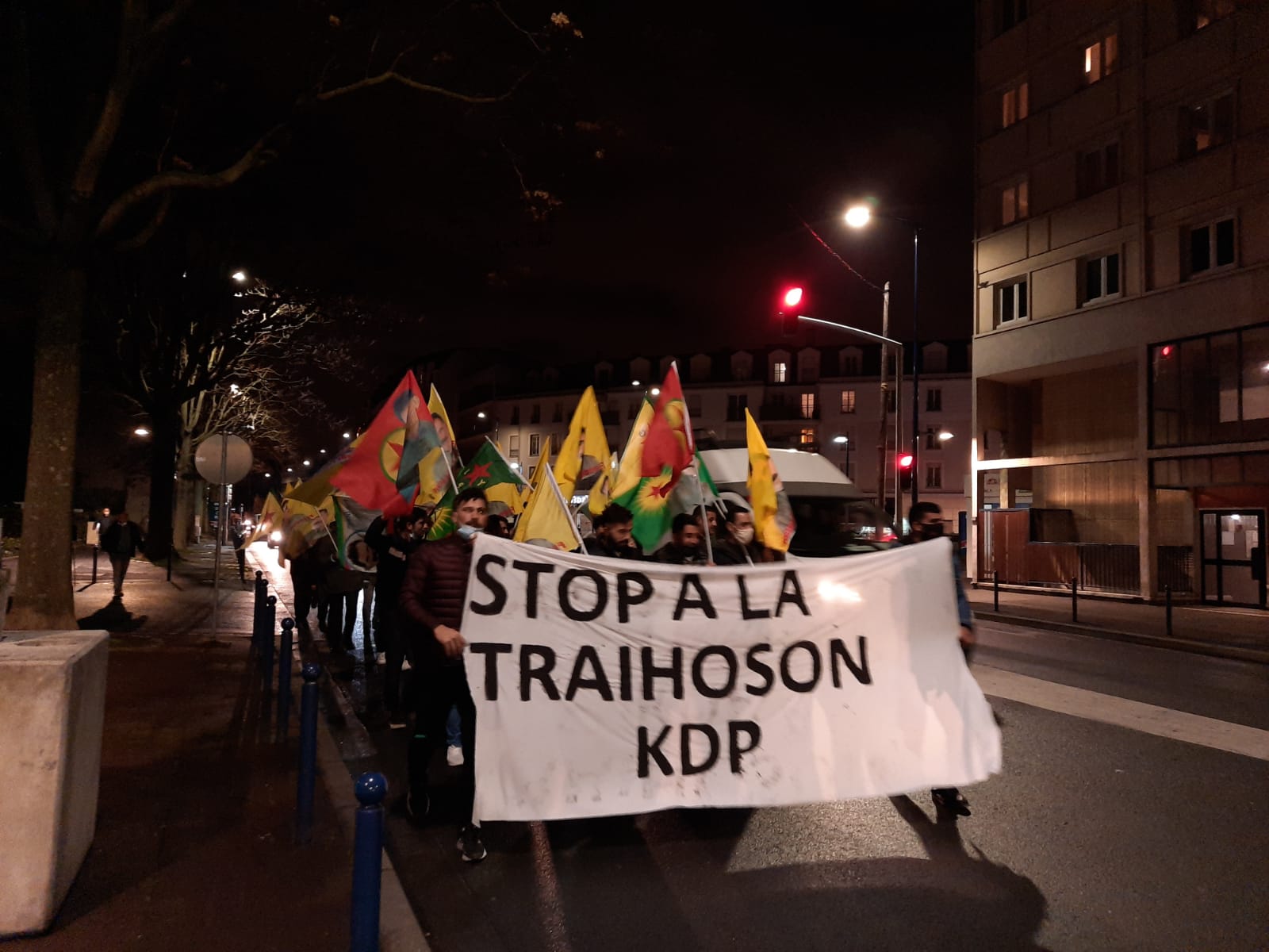 Yürüyüş, Kürdistan devrim şehitleri anısına 1 dakikalık saygı duruşunun ardından başladı. Eylemde “Stop a la traihoson KDP” yazılı bir pankart taşıyan gençler, sık sık “Bi Hev Re Serhildan”, “Bimre Îxanet”, “Bijî Serok APO”, “A Bas Le Régime Fasciste En Turquie (Kahrolsun Faşist Türk Rejimi)” sloganlarını attı.