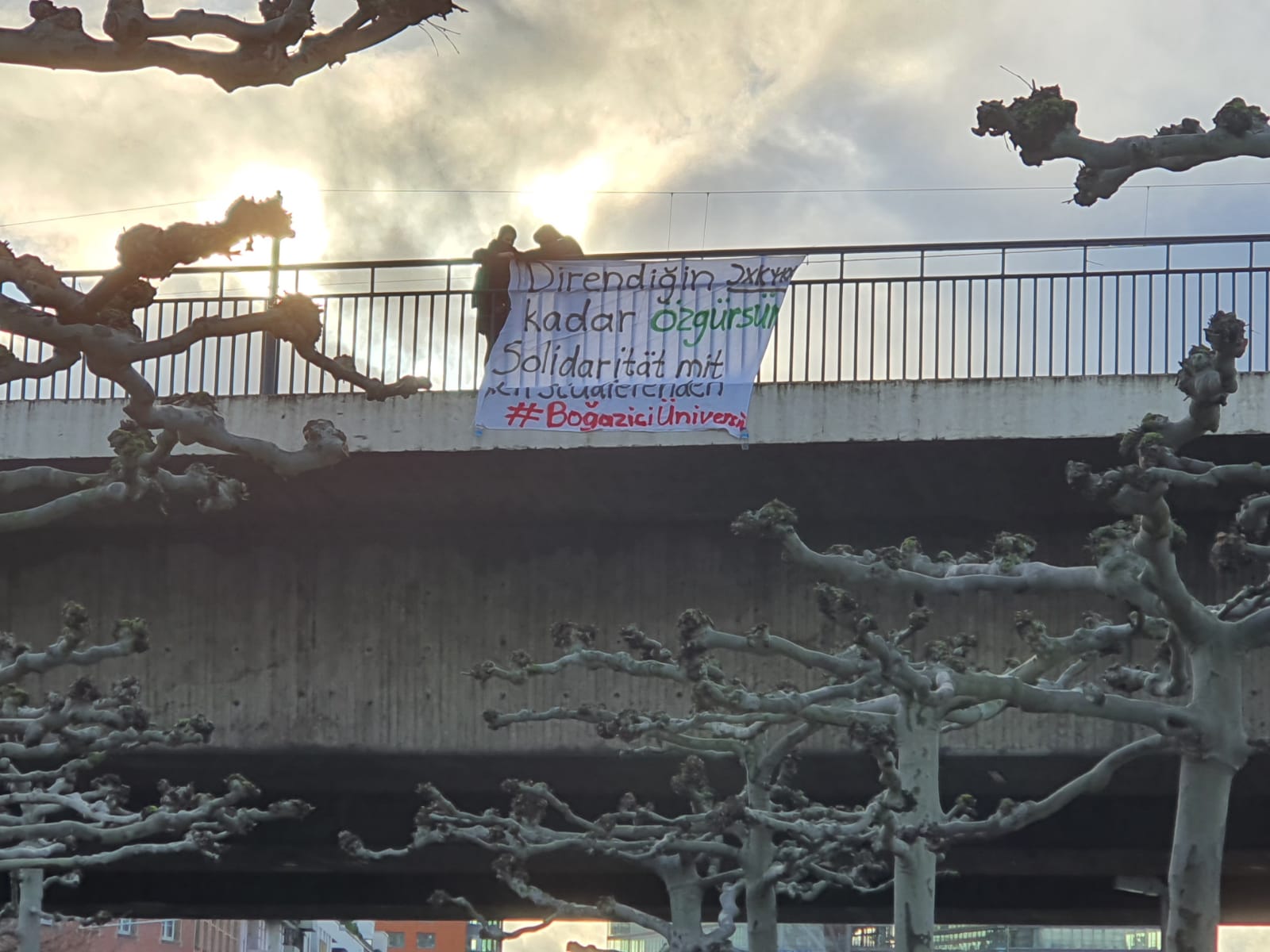 JXK-YKX, Düsseldorf Parlementosunun yanındaki köprüye astığı “Direndiğin Kadar Özgürsün” pankartıyla İstanbul Boğaziçi Üniversitesi öğrencilerinin kayyum rektöre karşı başlatmış olduğu direnişi desteklediklerini belirtti.