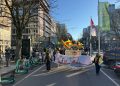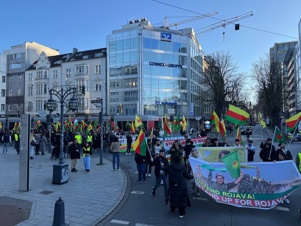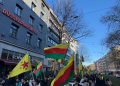 Yürüyüş güzergahı boyunca, Rojava’daki sivil yaşam alanlarına yönelik saldırılar ve Türk devletinin gerçekleştiği katliamlar hakkında Almanca hazırlanan açıklama okundu.