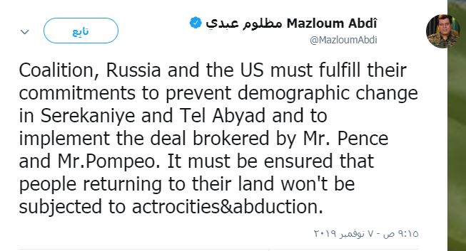 HABER MERKEZİ– QSD Genel Komutanı Mezlûm Ebdî, resmi twitter hesabından açıklamalarda bulundu. Ebdî, “Uluslararası Koalisyon, Rusya ve ABD, Serêkaniyê ve Girê Spî’nin demografik yapısının değiştirilmesini önlemek ve bay Pence (ABD Başkan Yardımcısı Mike Pence) ile bay Pompeo’nun (ABD Dışişleri Bakanı Mike Pompeo) aracılık ettiği anlaşmayı uygulamak için taahhütlerini yerine getirmelidir. Topraklarına geri dönen sivillerin hak ihlalleri ile karşılaşmaması ve kaçırılmamaları garanti edilmelidir” dedi.