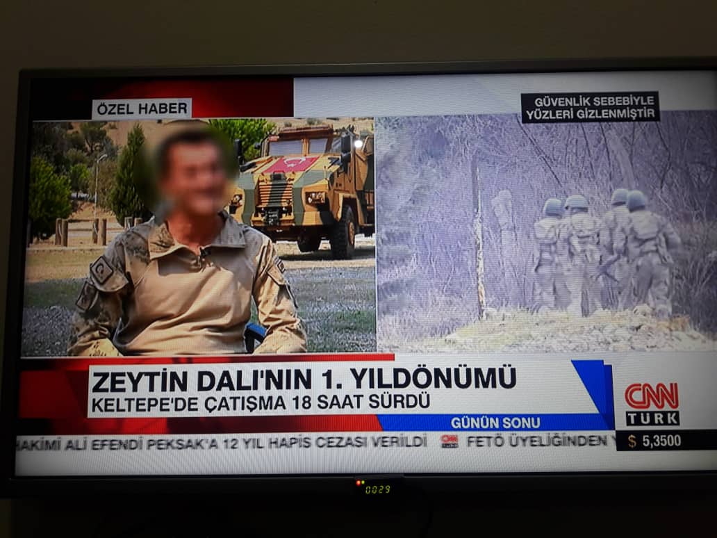 CNN Türk tarafından hazırlanan “Zeytin Dalı Harekatı’nın Birinci Yılı” adlı özel haberde, dikkat çekici bir görüntü ekranlara yansıdı. Özel Haber’de işgal saldırılarına katılan bir işgalci Türk askerinin oturarak verdiği röportajda yüzünün flulaştırılarak kapatıldığı görülürken, Askerin askeri bir yerde ve arkasında kirpi tipi zırhlı aracın olduğu görüldü. Kahramanlık hikayelerinin anlatıldığı haberde işgalci askerin yüzünün korkudan kapatıldığı görülürken, kahramanının yüzününün kapatılması ise ayrıca dikkatleri çeken bir nokta.
