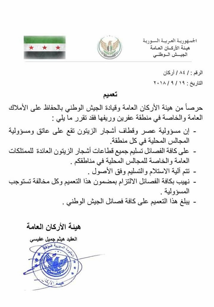 Türk devleti, çiftçilerin arazi ve hasatlarını kendisinin kurduğu meclise teslim etmesi için kentte bildiri dağıttı. Türk ordusuna bağlı ‘Genel Konsey’ tarafından dağıtıldığı belirtilen bildiride, tüm çiftçilerin arazi ve hasatlarını “işgalci İç meclise” teslim etmesi çağrısı yapılıyor.