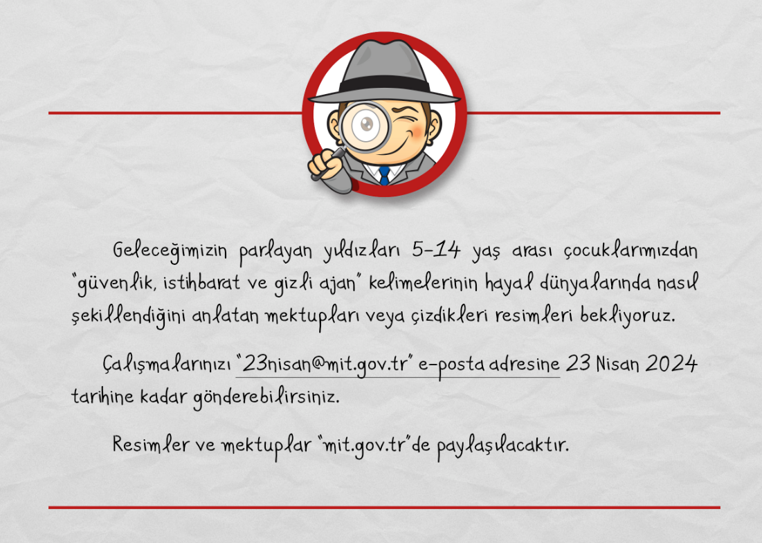 (MİT), 23 Nisan dolayısıyla çocuklardan ‘güvenlik’, ‘istihbarat’ ve ‘gizli ajan’ kelimelerini resimle ya da mektupla kağıda dökmelerini istedi. MİT’in internet sitesindeki duyuruda, 5-14 yaş arasındaki çocuklar hayal güçlerini kullanmaya davet edildi.