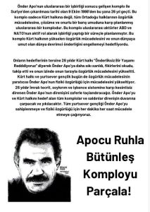 Onların hedeflerinin tersine 26 yıldır Kürt halkı “Önderliksiz Bir Yaşamı Reddediyoruz” diyerek Önder APO’ya daha sıkı sarıldı, fikirlerini okudu, takip etti ve onun izinde onun tarzıyla özgürlük mücadelesini yükseltti. Kürt halkı ve yurtsever gençlik bugün de özgürlük mücadelesinin yaratıcısı Önder APO’nun fiziki özgürlüğü için mücadelesini yükseltiyor. 26 yıldır İmralı tecrit, soykırım ve işkence sistemine karşı kesintisiz direnen Önder APO’nun direnişini zaferle taçlandıracağız. Önder APO’yu ve Kürt halkını hedef alan tüm komplolar ve saldırılar direnişin duvarına çarpacak ve yıkılacaktır. Tüm yurtsever gençliği Önder APO’yu sahiplenmeye ve fiziki özgürlüğü için her dakika her saat mücadele etmeye çağırıyoruz.