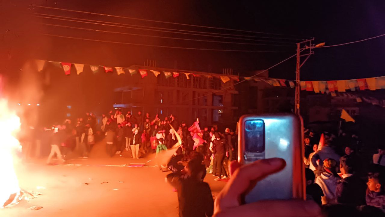 Gençlerin yoğunlukta olduğu Newroz’da mahalle meydanına gelindiğinde burada bekleyen kitle “Bijî serok Apo” sloganları eşliğinde kitleyi karşıladı. Ardından lastikler ateşe verilirken Êlih’in bu seneki ilk Newroz ateşi yakıldı. Newroz ateşi etrafından halaya duran kitle, alkış, slogan ve zılgıtlar eşliğinde ateşin üstünden atladı.