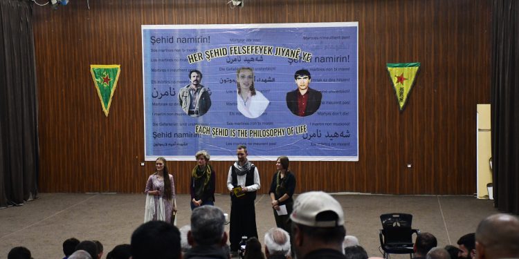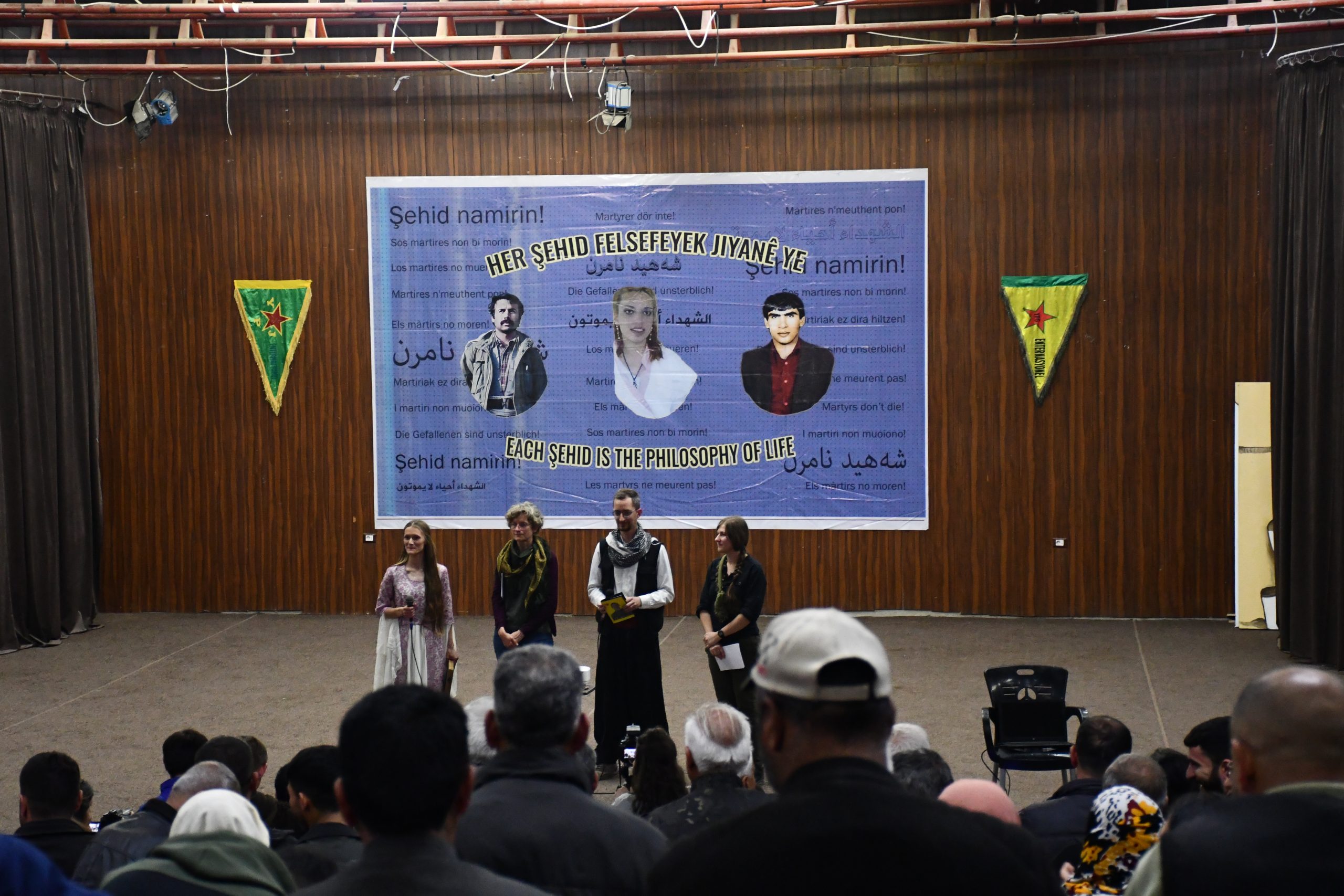 HESEKÊ – Bugün Hesekê’de yüzlerce kişi Rojava Devrimini savunmak için canlarını veren enternasyonalist şehitlerin anılarını anmak için şehir tiyatrosunda bir araya geldi. Katılımcılar arasında 17 Ekim 2019’da Türk faşist devletinin işgaline karşı Serekaniye’yi savunma mücadelesinde şehit düşen Şehit Andok Çotkar’ın (Konstantin Gedig) ailesi de vardı.