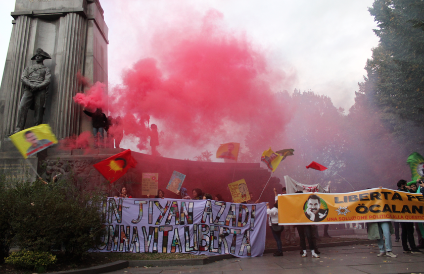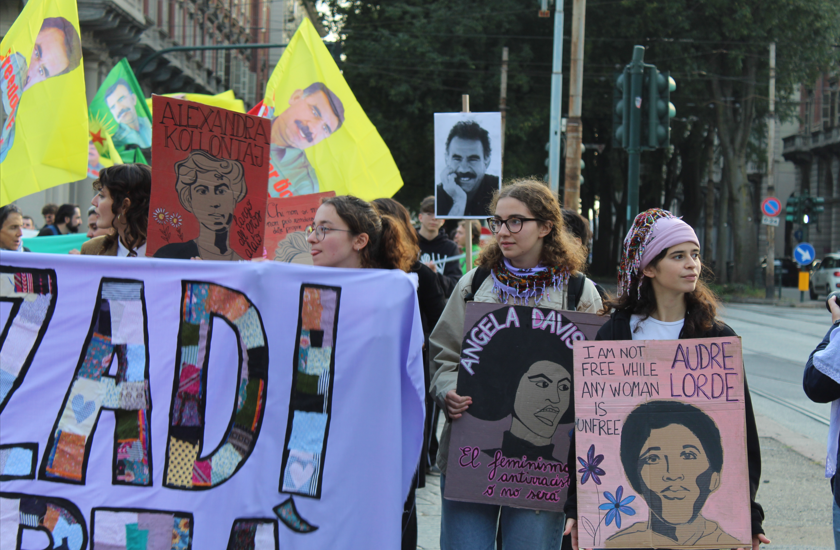 Genç kadınlar, yürüyüşünü kitlenin yoğun olduğu Piazza Castello meydanında ‘Libertà per Öcalan’ (Öcalan’a Özgürlük) yazarak devam ettirdi.