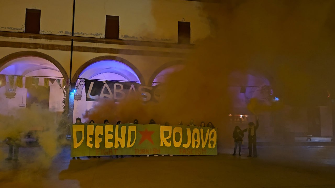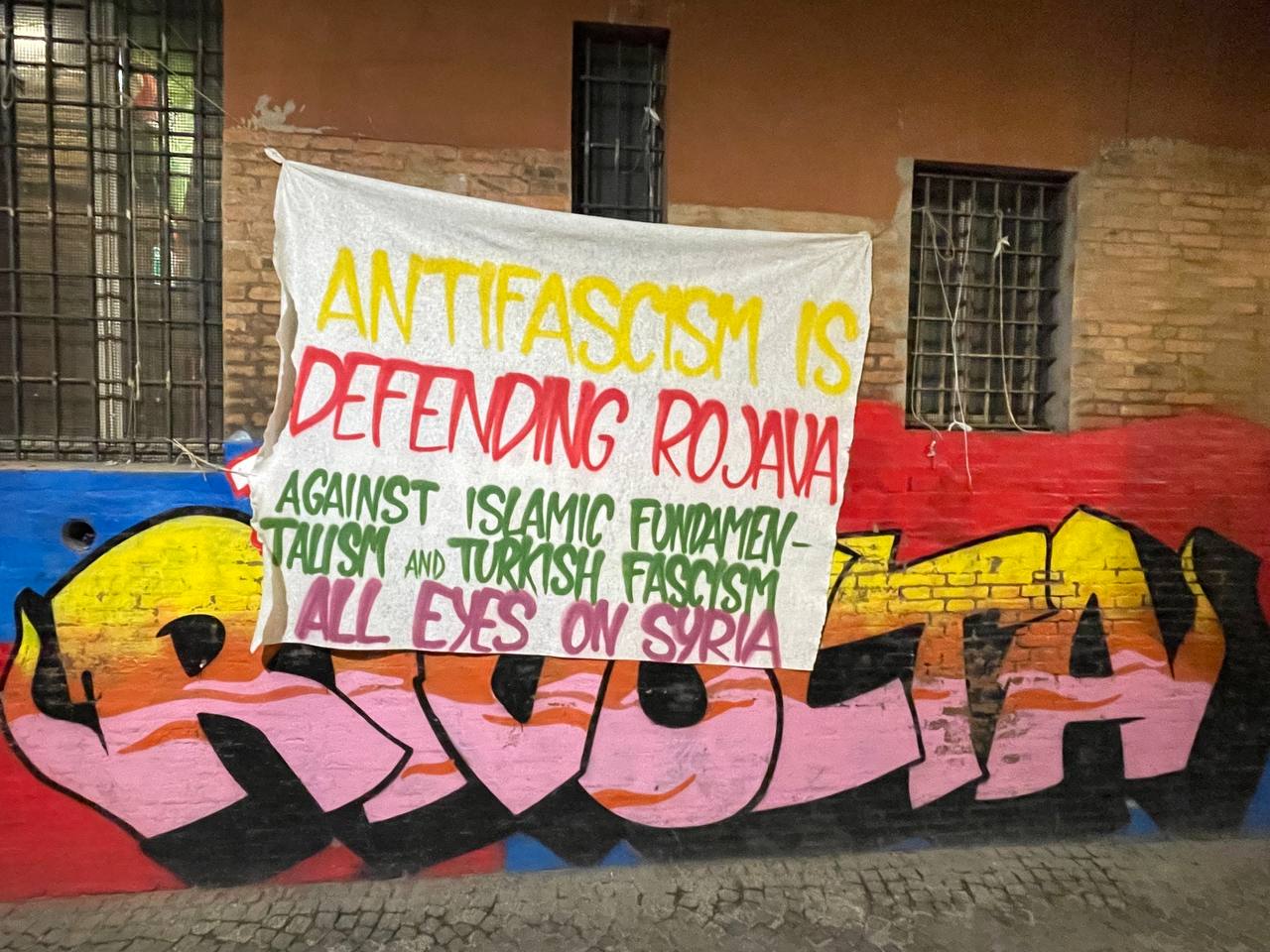 Etkinlik sonrası meşaleler eşliğinde “DEFEND ROJAVA (Rojava’yı Savun)” ve “ANTIFASCISM IS DEFENDİNG ROJAVA, AGAINST ISLAMIC FUNDAMENTALISM AND TURKISH FASCISM, ALL EYES ON SYRIA (Aşırı İslamcılık ve Türk faşizmine karşı Antifaşizm Rojava’yı savunuyor. Tüm gözler Suriye’de)” yazılı pankartlar açıldı.