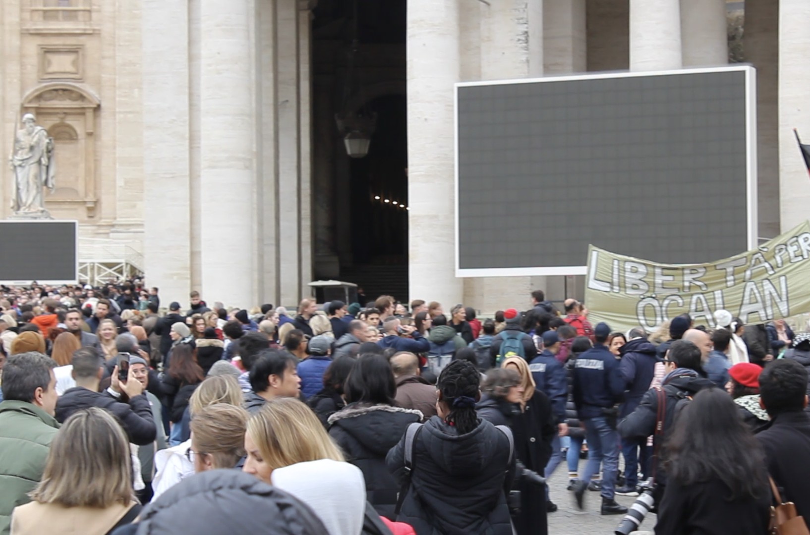 VATİKAN – Enternasyonalist gençler “Önder APO’ya Özgürlük Kürt Sorununa Çözüm” hamlesi kapsamında, Piazza San Pietro meydanında Papa Fransis’in Noel bayramı konuşması sırasında binlerce insanın önünde “Öcalan’a Özgürlük” yazılı pankart ve sloganlarla Önder APO üzerinden tüm Kürt halkını hedef alan soykırım saldırılarına dikkat çekti.