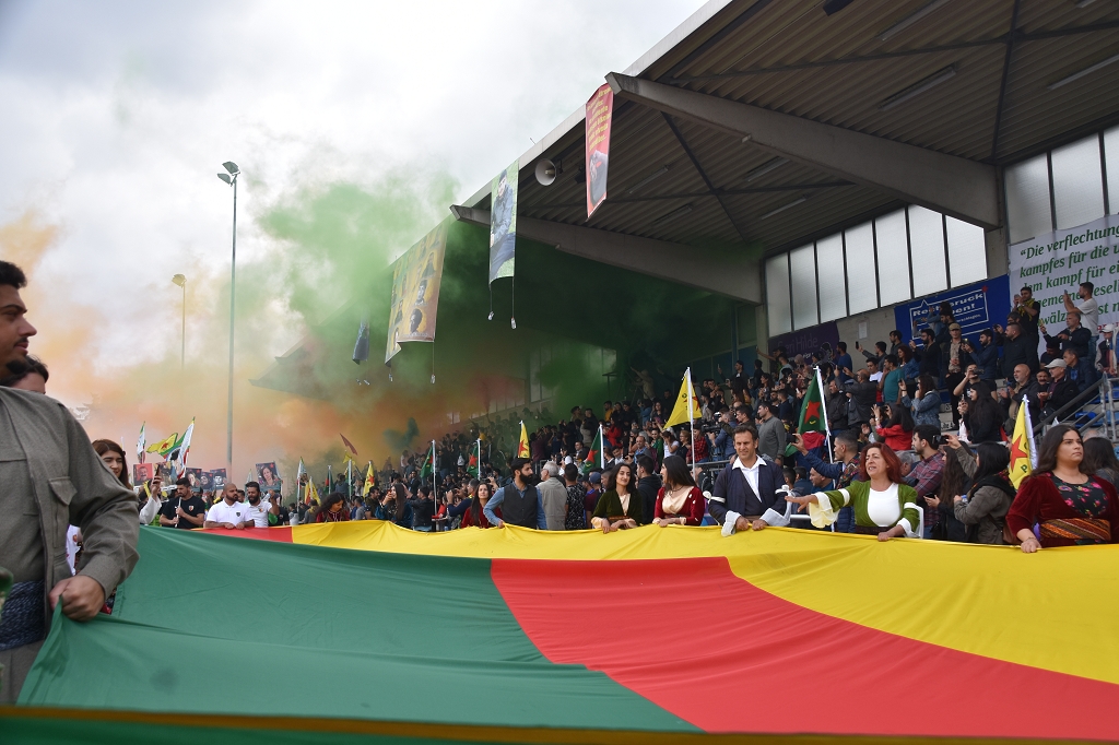 Kürt ve Enternasyonelist gençlerden oluşan bir kortej ve katılımcıların başta Tüm Devrim Şehitleri anısına bir dakikalık saygı duruşunun ardından kortejde ellerinde Şehitlerin fotoğrafları, Halklar Önderi Abdullah Öcalan bayrakları ,YPG-YPJ bayrakları ile yürüyüşe geçti. Yürüyüş esnasında sık sık Devrim şehitleri adına, Halklar Önderi Abdullah Öcalan adına ve Solidarität sloganları atıldı.