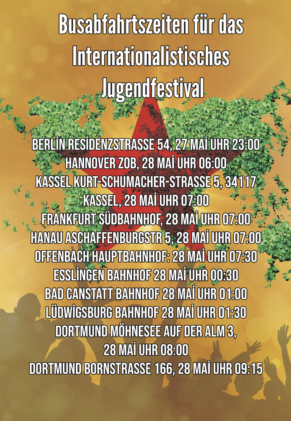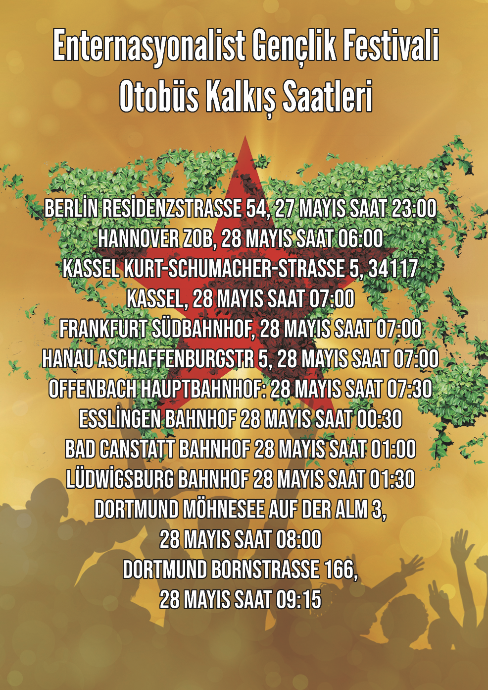 HABER MERKEZİ – 28 Mayıs 2022’de Almanya’nın NRW eyaletinde bulunan Lützerath’ta gerçekleşecek Enternasyonalist Gençlik Festivali’ne katılım sağlamak isteyen kişiler aşağıda verilen saatlerde otobüslerle alana giriş sağlayabilirler.