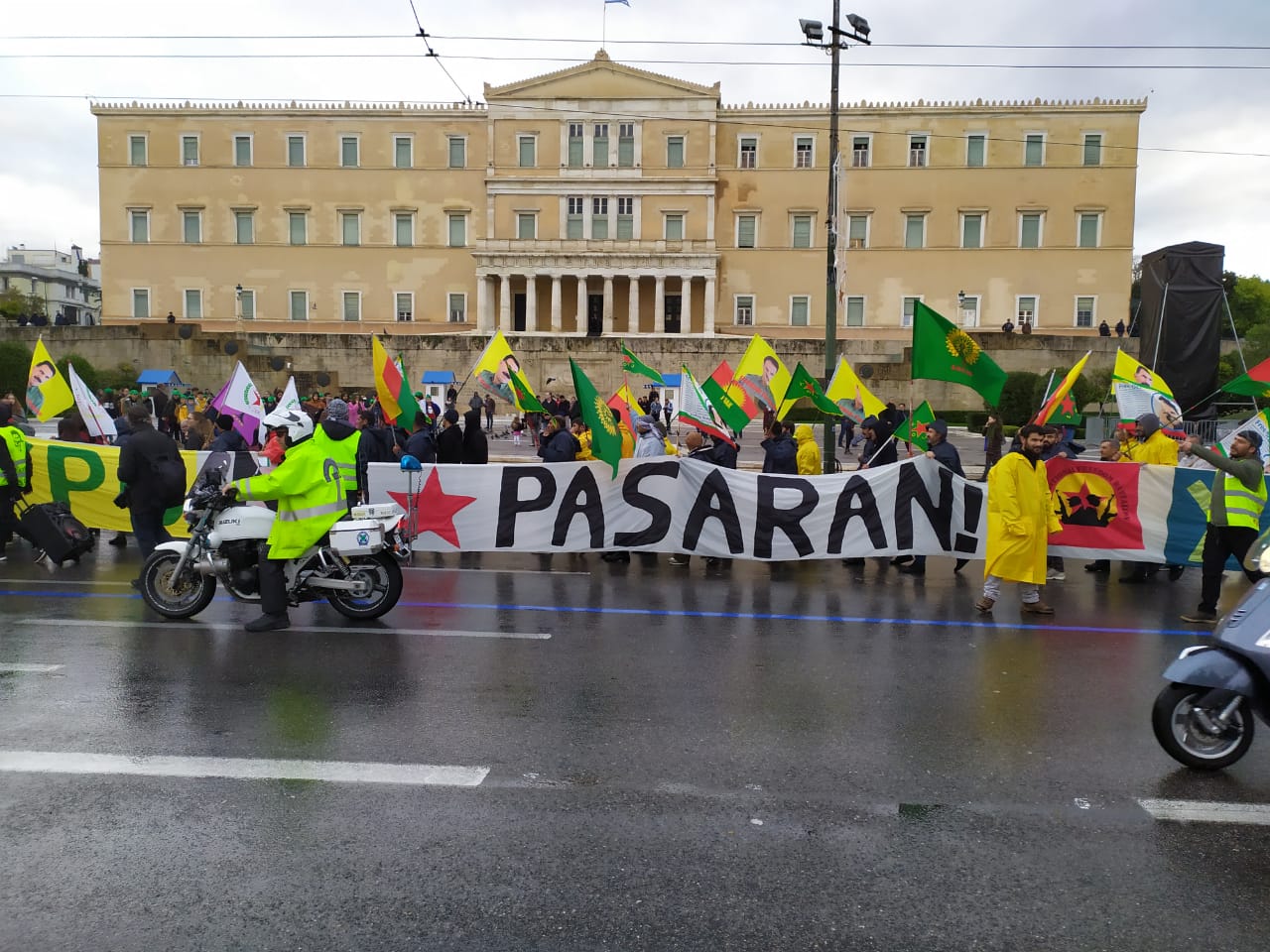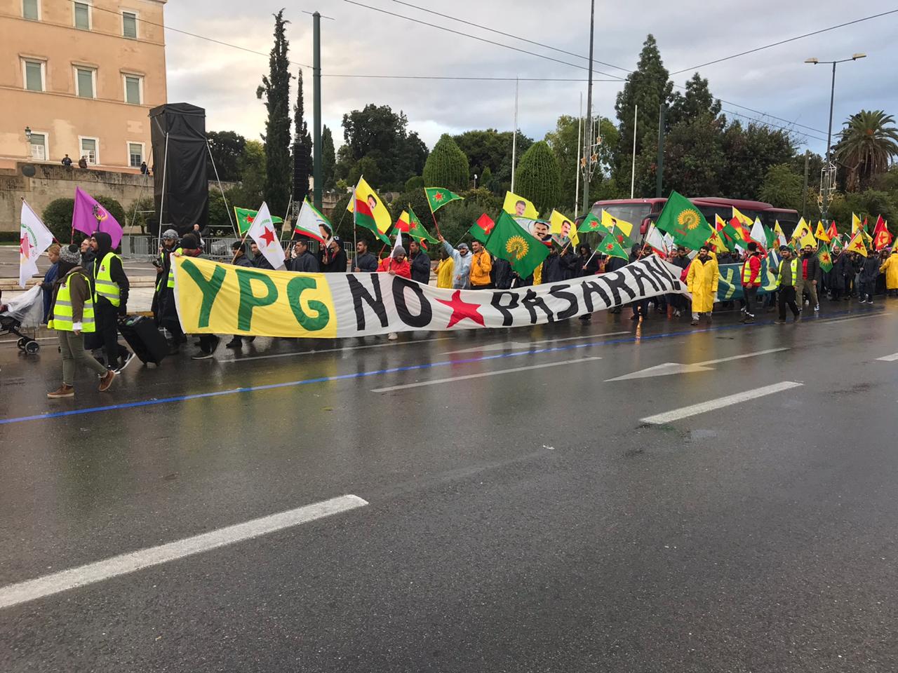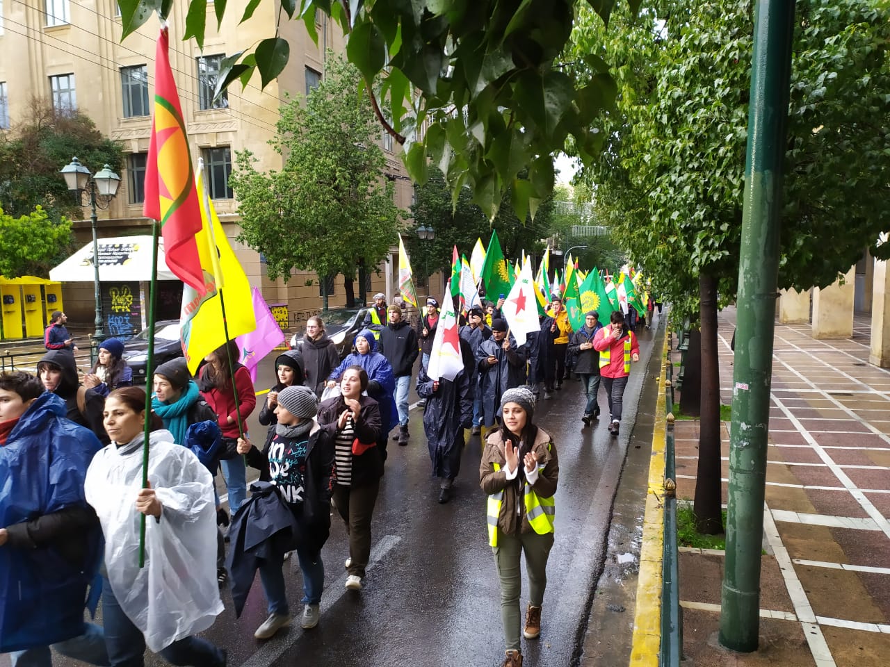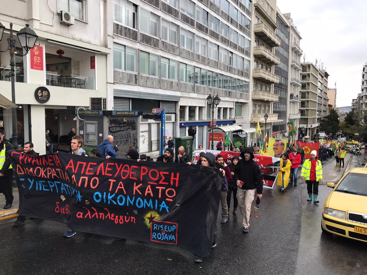 Halklar Önderi Abdullah Öcalan’ın posterleri, YPG/YPJ bayrakları ve işgalci Türk devletinin işgal saldırıları ile Cenga Rojava Direnişi’ni anlatan İngilizce ve Kürtçe pankartların taşındığı yürüyüş, işgal saldırılarını kınayan sloganlar eşliğinde kentin ana caddeleri boyunca devam etti. Yürüyüş boyunca işgal saldırılarına ilişkin Yunanca bildiriler de dağıtılırken, çevreden geçen halk da alkış ve ıslıklarla yürüyüşe destek verdi.