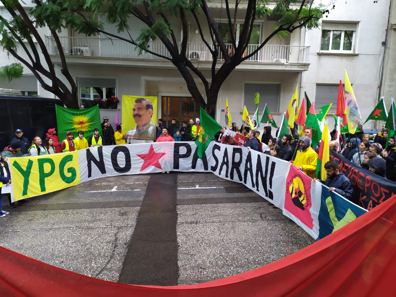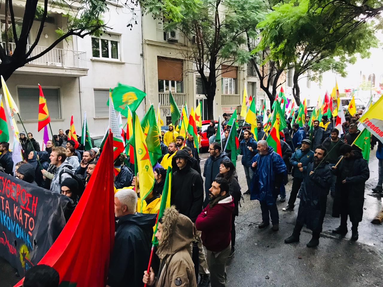 ATİNA- Yunanistan’ın başkenti Atina’da işgalci Türk devletinin Atina büyükelçiliğine kitlesel yürüyüş gerçekleştiren yüzlerce Kürt ve Kürt dostu, işgalci Türk devletinin Rojava Kurdistan’ı ve Kuzey Suriye’ye dönük işgal saldırıları protesto etti.
