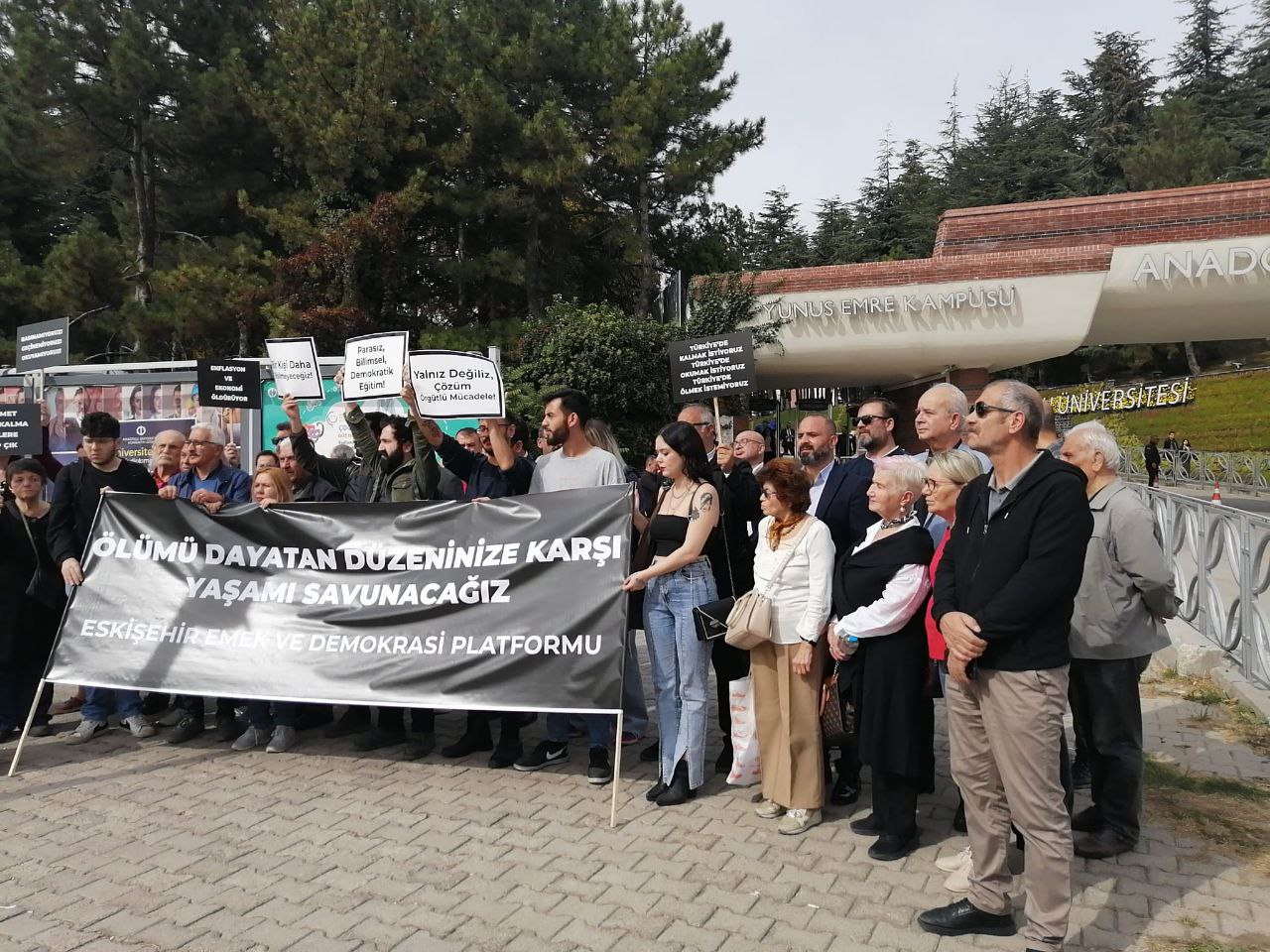 Eskişehir Emek ve Demokrasi Platformu adına konuşan avukat Mert Yedek, “Kentimizde bir hafta içinde iki gencimizi kaybettik. Eskişehir Teknik Üniversitesi Kimya Mühendisliği Öğrencisi S.N.R ve Anadolu Üniversitesinin merkez yemekhanesinde R.A. adlı öğrenci arkalarında çektikleri sıkıntıları ifade eden notlar bırakarak intihar etti. Bugün yüreğimiz kanıyor. Üzgün ve öfkeliyiz!” dedi.