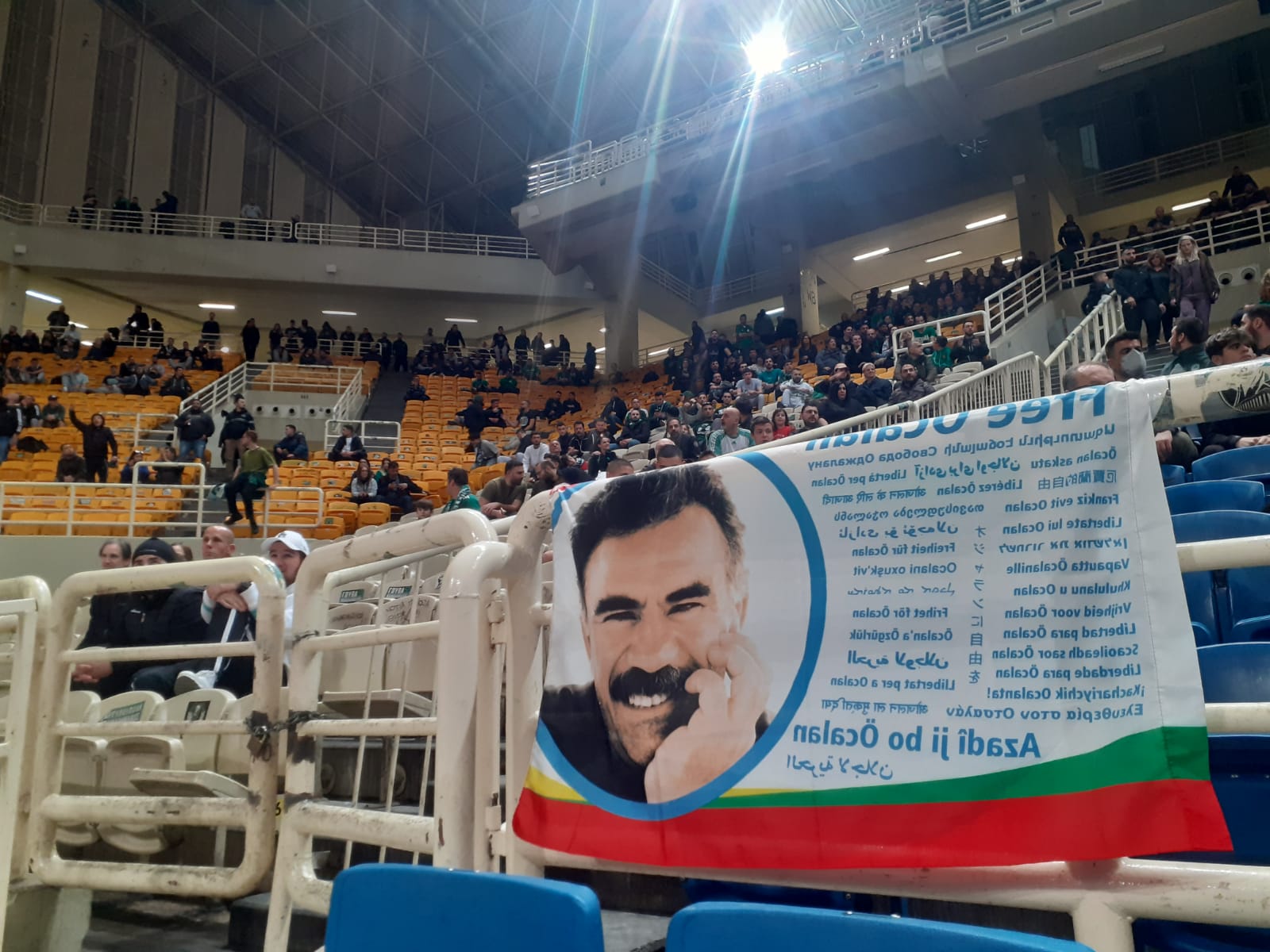 ATİNA – Yunanistan’ın başkenti Atina’da Panathinaikos ile Barcelona arasında oynanan Euroleague basketbol maçında ” Free Ocalan” (Öcalan’a Özgürlük) bayrağı açıldı. Önder Apo’ya Özgürlük Kampanyası çerçevesinde bir grup Yunanlı tarafından Atina’daki Euroleague basketbol maçında “Öcalan’a Özgürlük” bayrağı açıldı.