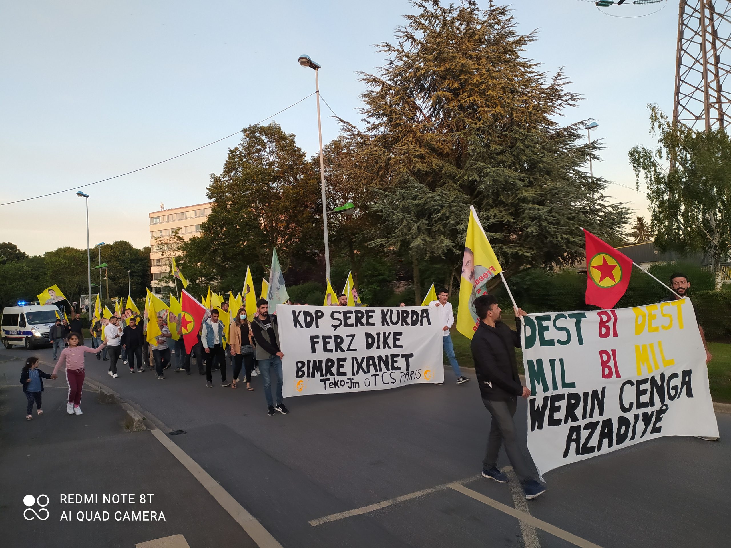 Kürdistan Devrim Şehitleri anısına bir dakikalık saygı duruşunun ardından yürüyüşlerine başladılar. Yürüyüş boyunca sık sık “Liberte Pour Öcalan”, “Bijî Serok APO” ve “Terorist Erdogan” sloganları atıldı. Gençler eylemde üzerinde “KDP şerê Kurda ferz dike – Bimre Îxanet” ve “Dest bi Dest, Mil bi Mil – Werin Cenga Azadiyê” yazılı pankartlar taşıdı.