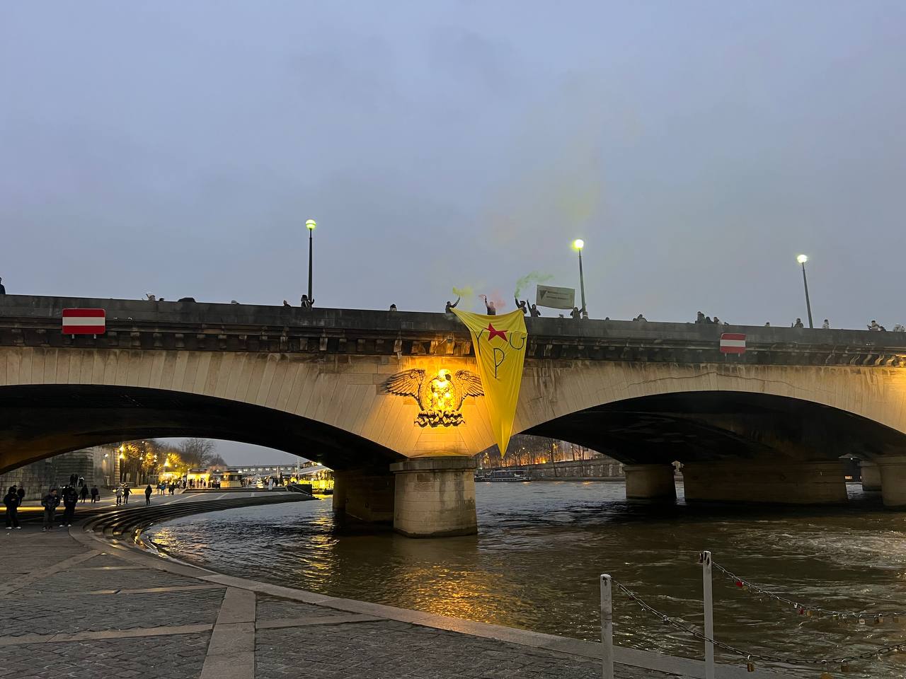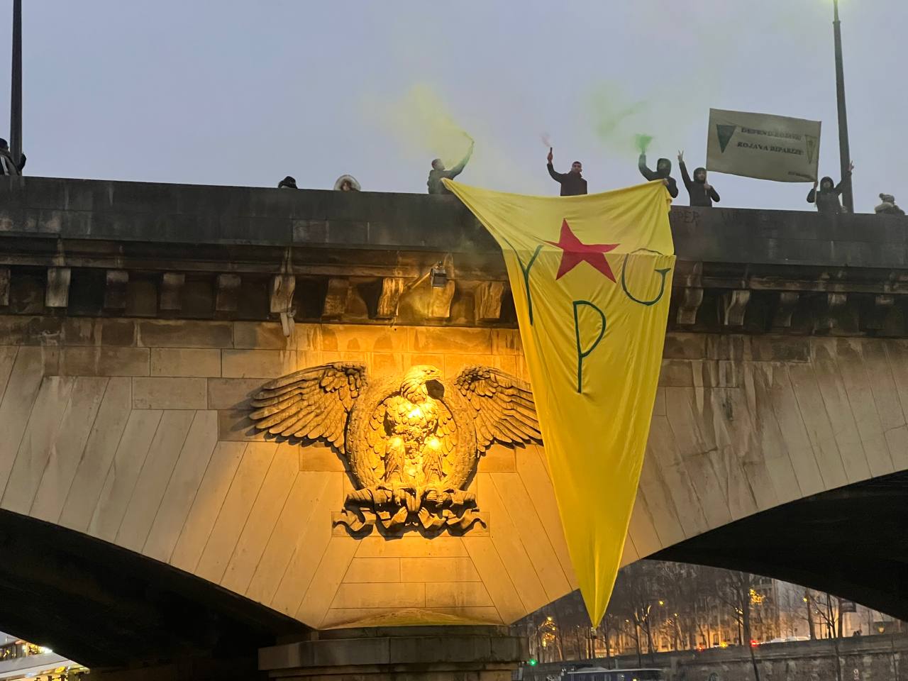 Gençler YPG bayrağını Eyfel Kulesinin yanında bulunan köprüye asarak, meşaleler yaktı. Eylemde sık sık “Bijî Berxwedana Rojava” sloganı atıldı.