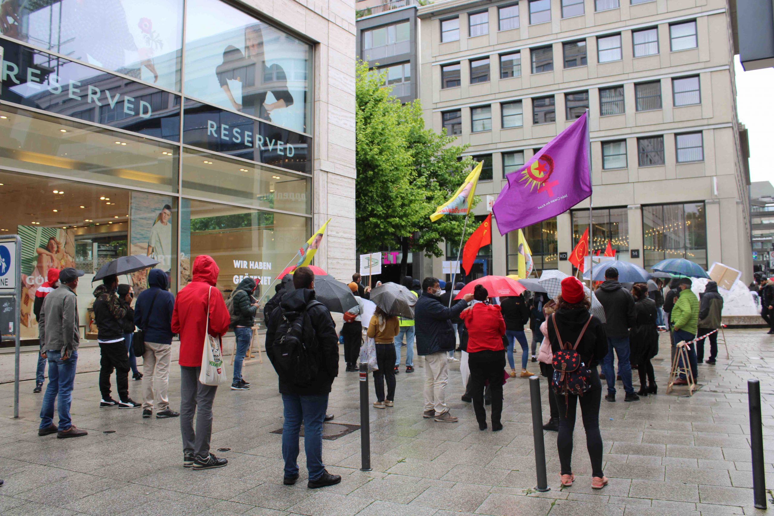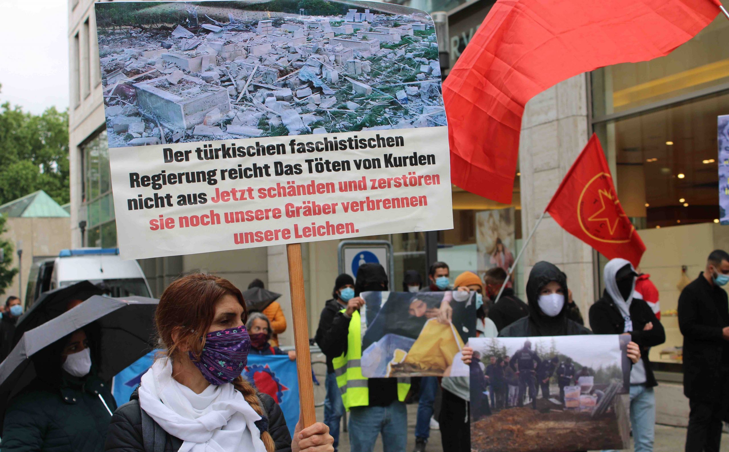 23 Mayıs öğlen saatlerinde Königstrasse’de toplanan yaklaşık 50 genç, üzerinde Almanca “Faşist Türk hükümeti için Kürtleri öldürmek yeterli değil. Şimdi de mezarlarımızı yıkıyor, yok ediyor ve ölülerimizi yakıyor” yazılı pankart açtı. Halklar Önderi Abdullah Öcalan’ın posterleri ile TCŞ, JCA ve MLKP posterlerinin açıldığı eylemde gençler, faşist Türk devletinin Kürt halkının değerlerine saldırısına karşı gençliği değerleri savunmaya çağırdı.