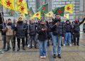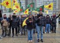 YPG ve YPJ bayrakları açan gençler, Kürdistan devrim şehitleri anısına yapılan saygı duruşu ardından Kürtçe ve Almanca dillerinde basın açıklamasında bulundu.