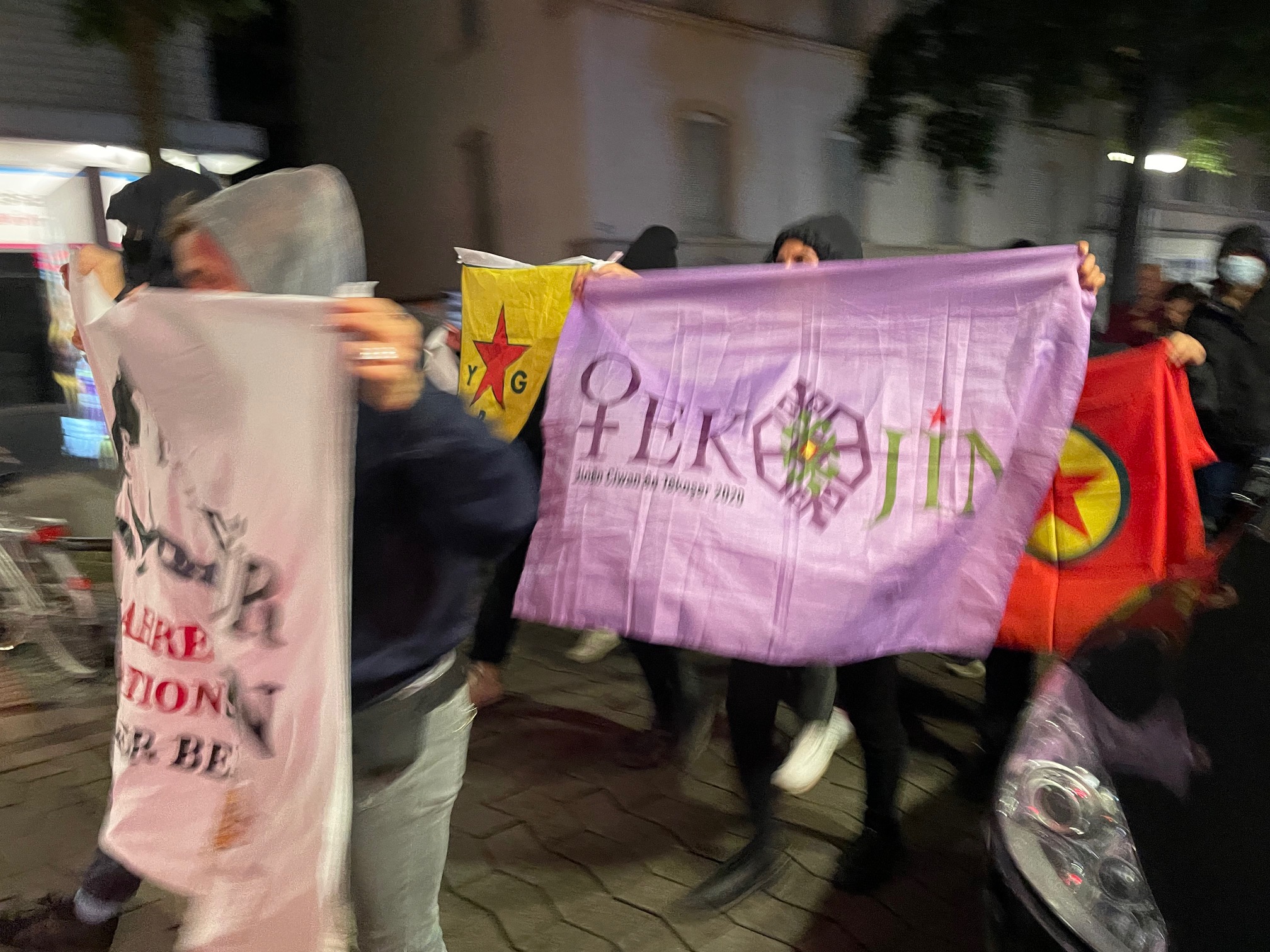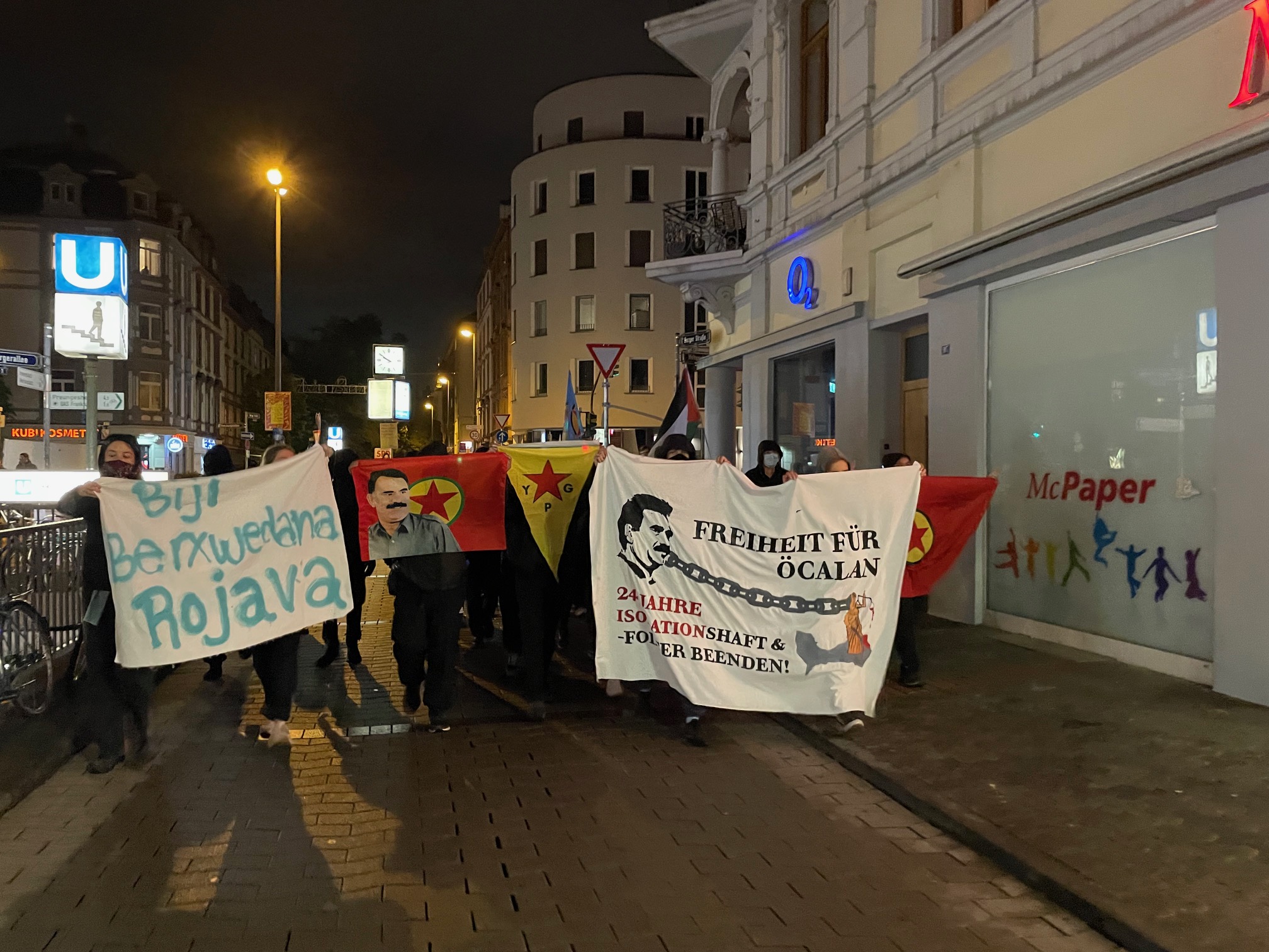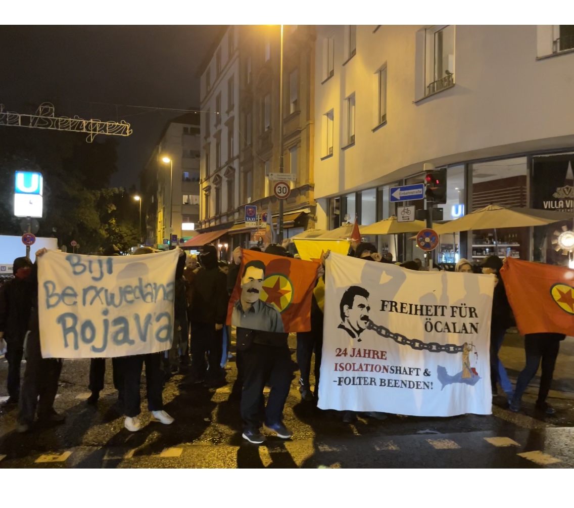 Eylemde “Bijî Serok APO” ve “Bijî Berxwedana Rojava” sloganlarının yanı sıra, Alman hükümetinin yaşanan savaşlardan kar elde ettiğini vurgulayan sloganlar atıldı.