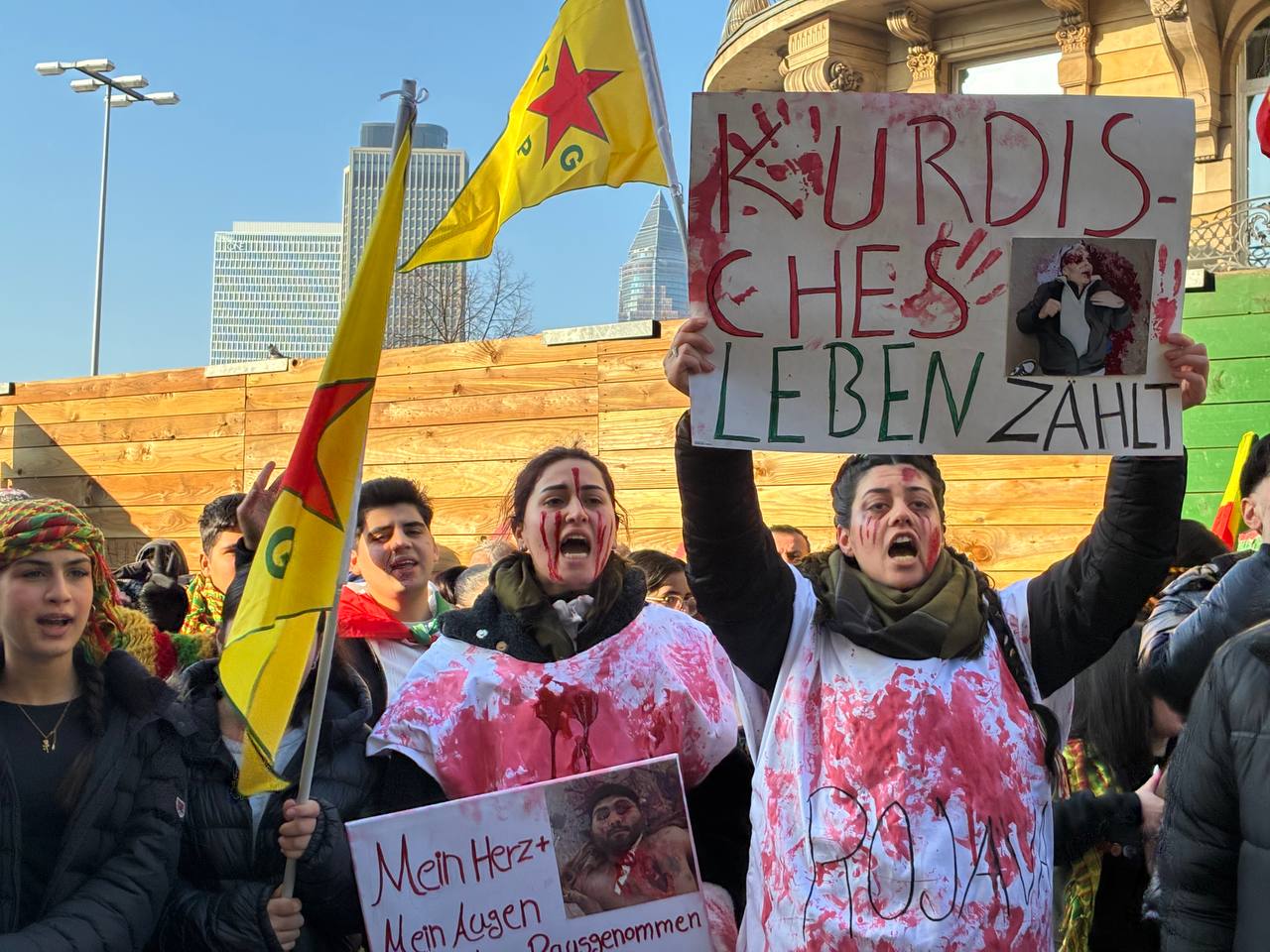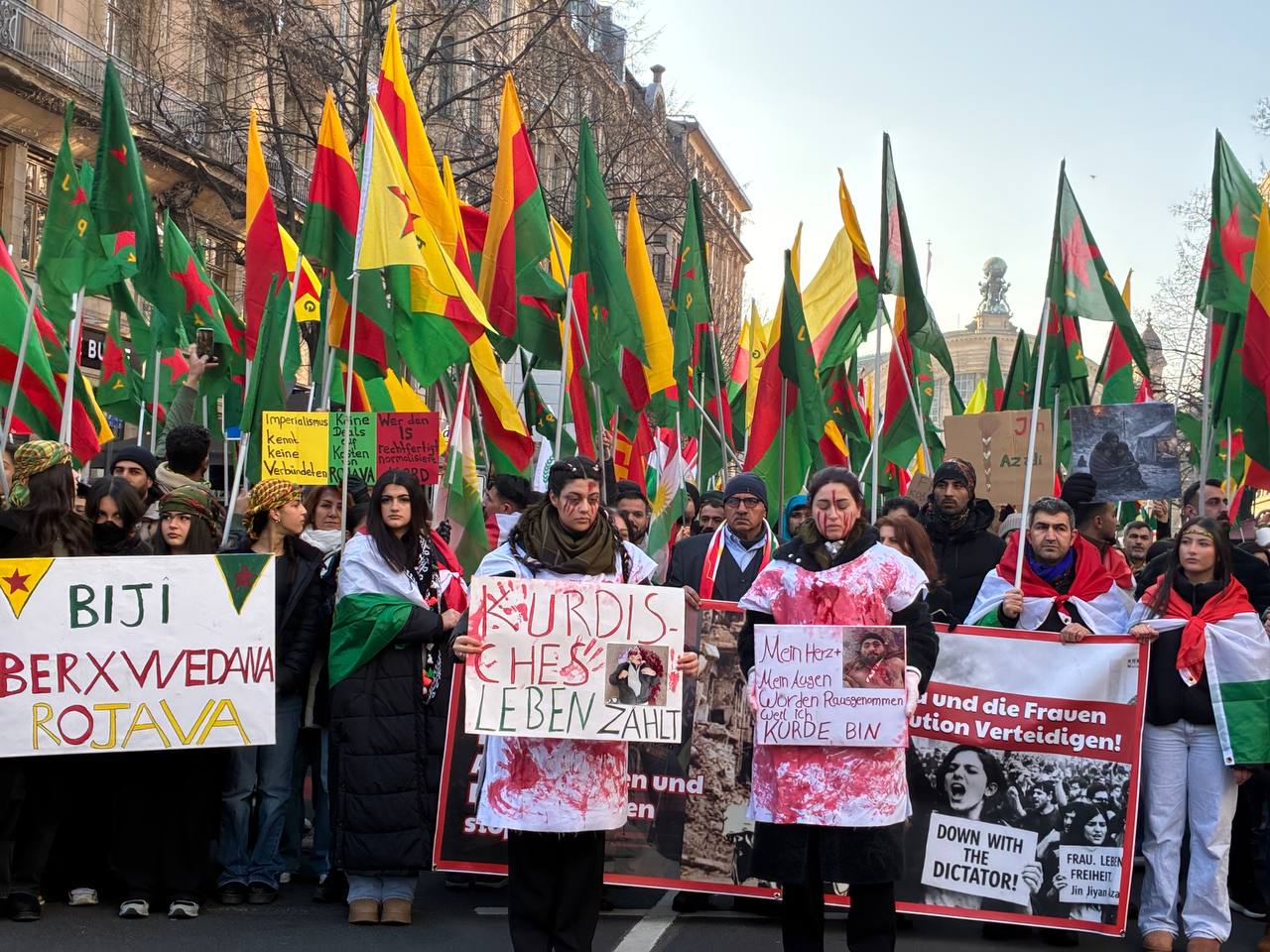 Eylem, Frankfurt Hauptbahnhof (Merkez Tren İstasyonu) önünde başladı. On bine yakın Kürt genci, kadını, enternasyonalisti ve dostu, ellerinde Rojava bayrakları, Jin-Jiyan-Azadî pankartları ve HTŞ saldırılarını kınayan dövizlerle toplandı. Kitle, şehitler için bir dakikalık saygı duruşunda bulunurken meydan adeta yürek yangınına döndü.